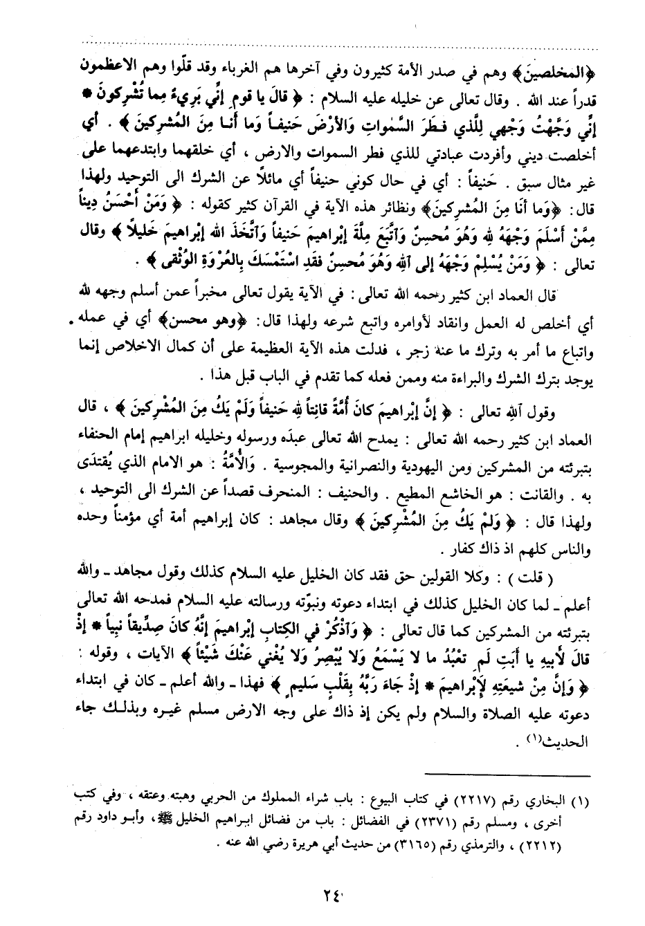 "قلت ": وكلا القولين حق فقد كان الخليل - عليه السلام – كذلك، وقول مجاهد- والله أعلم- لما كان الخليل كذلك في ابتداء دعوته ونبوته ورسالته عليه السلام فمدحه الله تعالى بتبرئته من المشركين كما قال تعالى: {وَاذْكُرْ فِي الْكِتَابِ إِبْرَاهِيمَ إِنَّهُ كَانَ صِدِّيقاً نَبِيّاً. إِذْ قَالَ لأَبِيهِ يَا أَبَتِ لِمَ تَعْبُدُ مَا لا يَسْمَعُ وَلا يُبْصِرُ وَلا يُغْنِي عَنْكَ شَيْئاً} 7 الآيات، وقوله: {وَإِنَّ مِنْ شِيعَتِهِ لإِبْرَاهِيمَ. إِذْ جَاءَ رَبَّهُ بِقَلْبٍ سَلِيمٍ} 8 فهذا- والله أعلم- كان في ابتداء دعوته عليه الصلاة والسلام ولم يكن إذ ذاك على وجه الأرض مسلم غيره وبذلك جاء الحديث9.