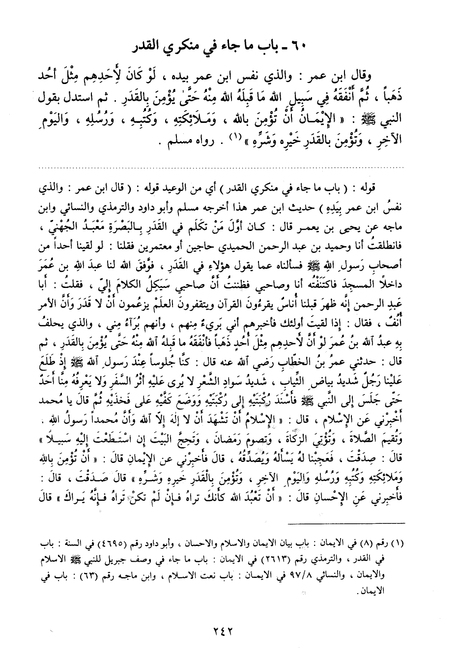 1 رقم (8) في الإيمان: باب بيان الإيمان والإسلام والإحسان , وأبو داود رقم (4695) في السنة: باب في القدر , والترمذي رقم (2613) في الإيمان: باب ما جاء في وصف جبريل للنبي صلى الله عليه وسلم الإسلام والإيمان , والنسائي 8/97 في الإيمان: باب نعت الإسلام , وابن ماجه رقم (63) : باب في الإيمان.