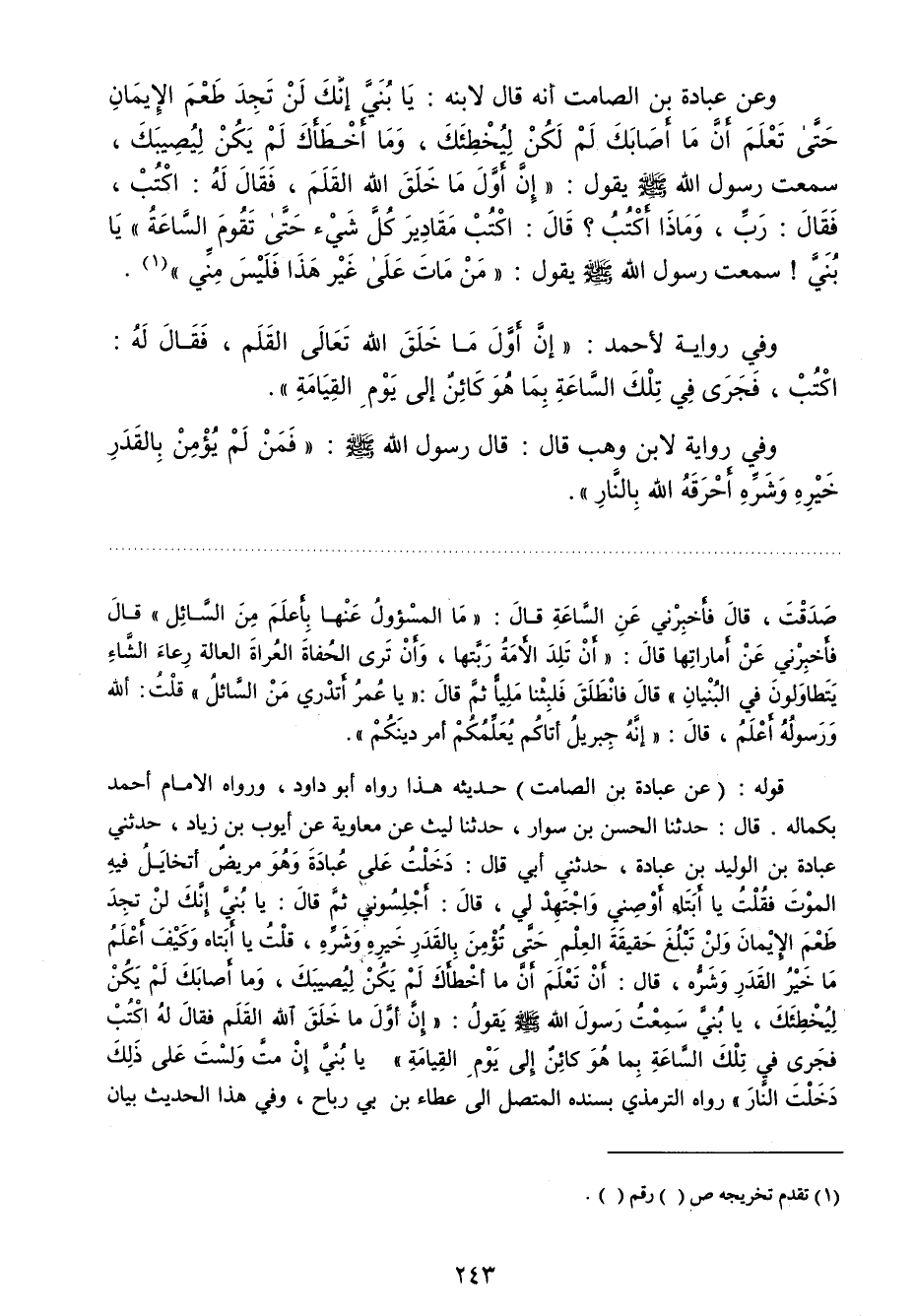 قوله: "عن عبادة بن الصامت " حديثه هذا رواه أبو داود، ورواه الإمام أحمد بكماله. قال: حدثنا الحسن بن سوار، حدثنا ليث عن معاوية عن أيوب بن زياد، حدثني عبادة بن الوليد بن عبادة، حدثني أبي قال: " دخلت على عبادة وهو مريض أتخايل فيه الموت، فقلت: يا أبتاه أوصني واجتهد لي، قال: أجلسوني ثم قال: يا بني إنك لن تجد طعم الإيمان، ولن تبلغ حقيقة العلم حتى تؤمن بالقدر خيره وشره، قلت: يا أبتاه وكيف أعلم ما خير القدر وشره؟ قال: أن تعلم أن ما أخطأك لم يكن ليصيبك، وما أصابك لم يكن ليخطئك، يا بني سمعت رسول الله صلي الله عليه وسلم يقول: إن أول ما خلق الله القلم، فقال له: اكتب فجرى في تلك الساعة بما هو كائن إلى يوم القيامة. يا بني إن مت ولست على ذلك دخلت النار "رواه الترمذي بسنده المتصل إلى عطاء بن أبي رباح، وفي هذا الحديث بيان