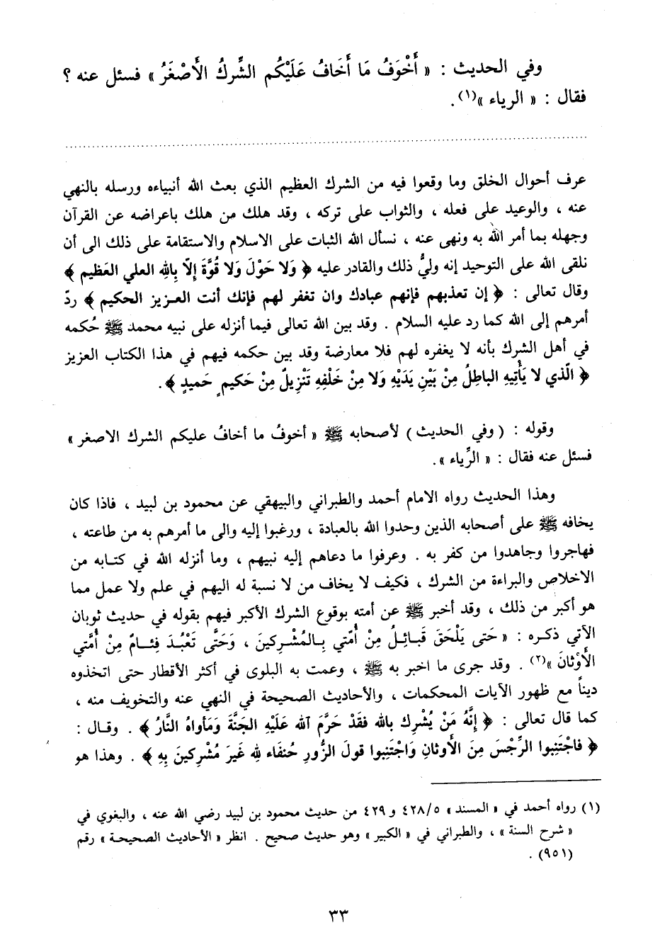 وهذا الحديث رواه الإمام أحمد والطبراني والبيهقي عن محمود بن لبيد، فإذا كان يخافه صلي الله عليه وسلم على أصحابه الذين وحدوا الله بالعبادة، ورغبوا إليه وإلى ما أمرهم به من طاعته، فهاجروا وجاهدوا من كفر به، وعرفوا ما دعاهم إليه نبيهم، وما أنزله الله في كتابه من الإخلاص والبراءة من الشرك، فكيف لا يخاف من لا نسبة له إليهم في علم ولا عمل مما هو أكبر من ذلك! وقد أخبر صلي الله عليه وسلم عن أمته بوقوع الشرك الأكبر فيهم بقوله في حديث ثوبان الآتي ذكره: " حتى يلحق قبائل من أمتي بالمشركين، وحتى تعبد فئام من أمتي الأوثان " 5، وقد جرى ما أخبر به صلي الله عليه وسلم وعمت به البلوى في أكثر الأقطار حتى اتخذوه دينا مع ظهور الآيات المحكمات، والأحاديث الصحيحة في النهي عنه والتخويف منه، كما قال تعالى: {إِنَّهُ مَنْ يُشْرِكْ بِاللَّهِ فَقَدْ حَرَّمَ اللَّهُ عَلَيْهِ الْجَنَّةَ وَمَأْوَاهُ النَّارُ} 6. وقال: {فَاجْتَنِبُوا الرِّجْسَ مِنَ الأَوْثَانِ وَاجْتَنِبُوا قَوْلَ الزُّورِ. حُنَفَاءَ لِلَّهِ غَيْرَ مُشْرِكِينَ بِهِ} 7 وهذا هو