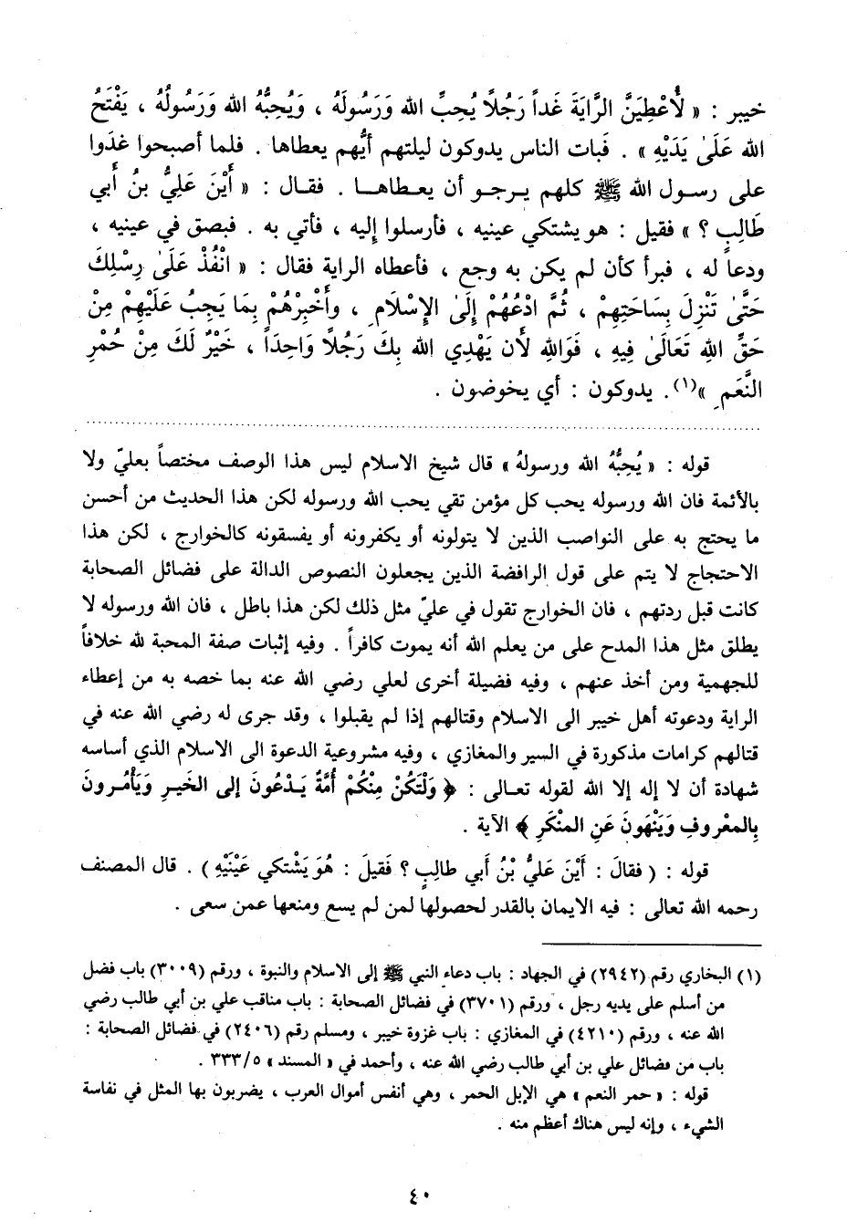 1 البخاري رقم (2942) في الجهاد: باب دعاء النبي صلى الله عليه وسلم إلى الإسلام وفي النبوة رقم (3009) باب فضل من أسلم على يديه رجل , ورقم (3701) في فضائل الصحابة: باب مناقب علي ابن أبي طالب رضي الله عنه , ورقم (4210) في المغازي: باب غزوة خيبر , ومسلم رقم (2406) في فضائل الصحابة: باب من فضائل علي ابن أبي طالب رضي الله عنه , وأحمد في "المسند" 5/ 333.