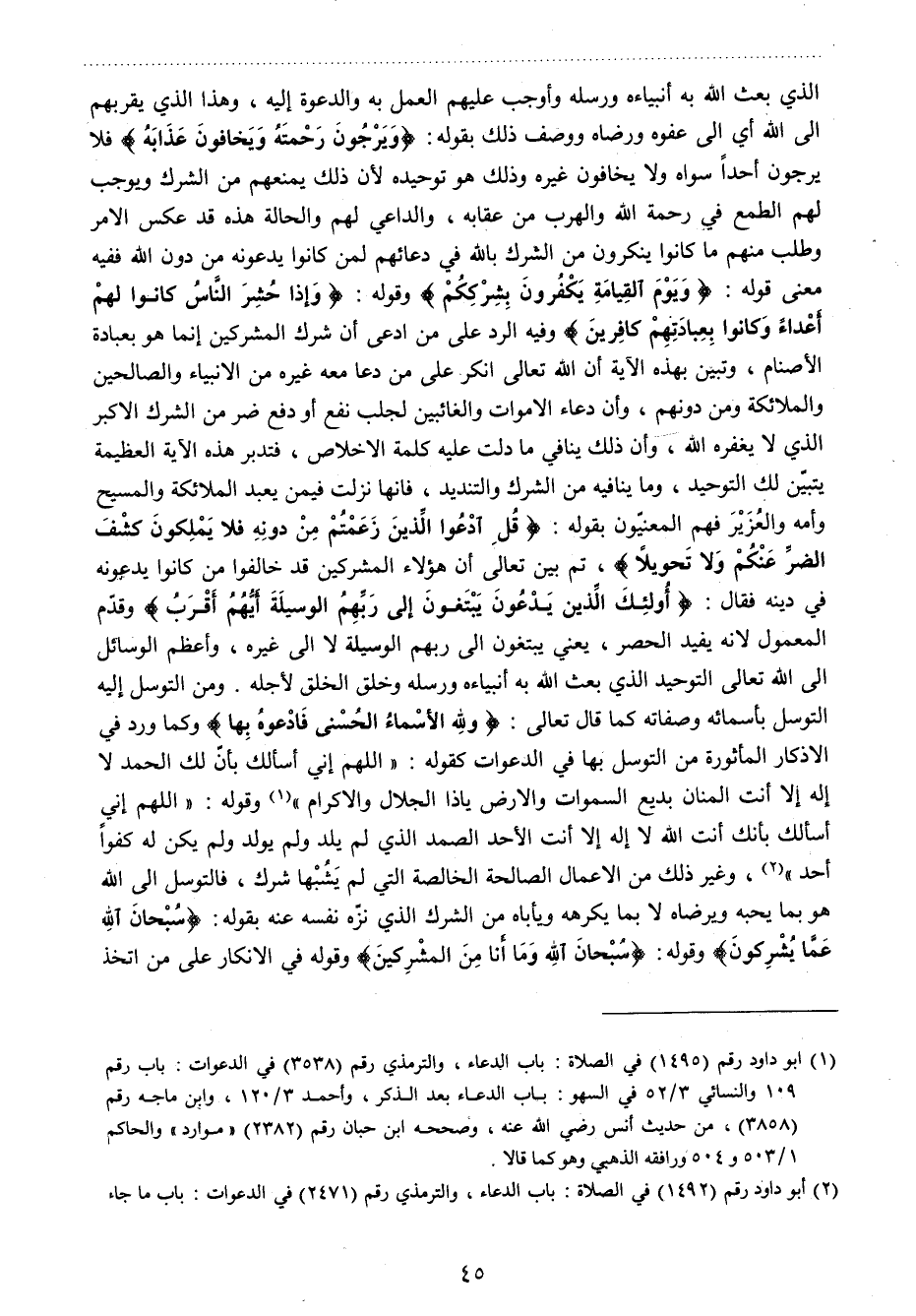 الذي بعث الله به أنبياءه ورسله وأوجب عليهم العمل به والدعوة إليه، وهذا الذي يقربهم إلى الله أي إلى عفوه ورضاه، ووصف ذلك بقوله: {وَيَرْجُونَ رَحْمَتَهُ وَيَخَافُونَ عَذَابَهُ} 1 فلا يرجون أحدا سواه ولا يخافون غيره، وذلك هو توحيده؛ لأن ذلك يمنعهم من الشرك ويوجب لهم الطمع في رحمة الله والهرب من عقابه، والداعي لهم والحالة هذه قد عكس الأمر وطلب منهم ما كانوا ينكرون من الشرك بالله في دعائهم لمن كانوا يدعونه من دون الله، ففيه معنى قوله: {وَيَوْمَ الْقِيَامَةِ يَكْفُرُونَ بِشِرْكِكُمْ} 2 وقوله: {وَإِذَا حُشِرَ النَّاسُ كَانُوا لَهُمْ أَعْدَاءً وَكَانُوا بِعِبَادَتِهِمْ كَافِرِينَ} 3 وفيه الرد على من ادعى أن شرك المشركين إنما هو بعبادة الأصنام، وتبين بهذه الآية أن الله تعالى أنكر على من دعا معه غيره من الأنبياء والصالحين والملائكة ومن دونهم، وأن دعاء الأموات والغائبين لجلب نفع أو دفع ضر من الشرك الأكبر الذي لا يغفره الله، وأن ذلك ينافي ما دلت عليه كلمة الإخلاص، فتدبر هذه الآية العظيمة يتبين لك التوحيد، وما ينافيه من الشرك والتنديد، فإنها نزلت فيمن يعبد الملائكة والمسيح وأمه والعزير فهم المعنيون بقوله: {قُلِ ادْعُوا الَّذِينَ زَعَمْتُمْ مِنْ دُونِهِ فَلا يَمْلِكُونَ كَشْفَ الضُّرِّ عَنْكُمْ وَلا تَحْوِيلاً} 4، ثم بين تعالى أن هؤلاء المشركين قد خالفوا من كانوا يدعونه في دينه فقال: {أُولَئِكَ الَّذِينَ يَدْعُونَ يَبْتَغُونَ إِلَى رَبِّهِمُ الْوَسِيلَةَ} 5، وقدم المعمول لأنه يفيد الحصر، يعني يبتغون إلى ربهم الوسيلة لا إلى غيره، وأعظم الوسائل إلى الله تعالى التوحيد الذي بعث الله به أنبياءه ورسله وخلق الخلق لأجله.