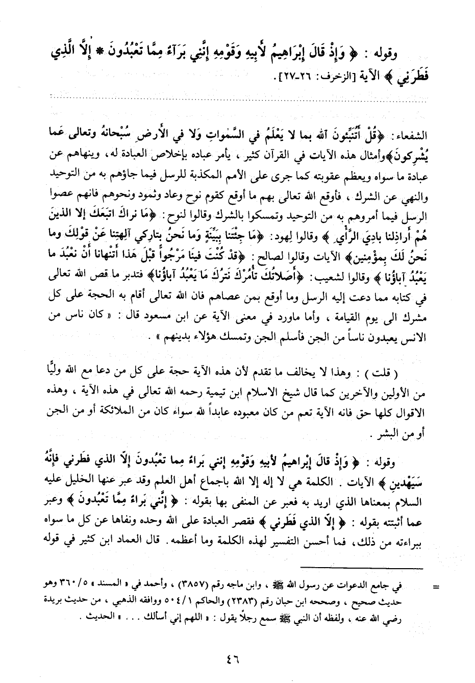 وقوله: {وَإِذْ قَالَ إِبْرَاهِيمُ لأَبِيهِ وَقَوْمِهِ إِنَّنِي بَرَاءٌ مِمَّا تَعْبُدُونَ. إِلا الَّذِي فَطَرَنِي فَإِنَّهُ سَيَهْدِينِ} 7 الآيات. الكلمة هي لا إله إلا الله بإجماع أهل العلم، وقد عبر عنها الخليل عليه السلام بمعناها الذي أريد به فعبر عن المنفي بها بقوله: {إِنَّنِي بَرَاءٌ مِمَّا تَعْبُدُونَ} 8، وعبر عما أثبتته بقوله: {إِلا الَّذِي فَطَرَنِي} 9 فقصر العبادة على الله وحده ونفاها عن كل ما سواه ببراءته من ذلك، فما أحسن التفسير لهذه الكلمة وما أعظمه. قال العماد ابن كثير في قوله
