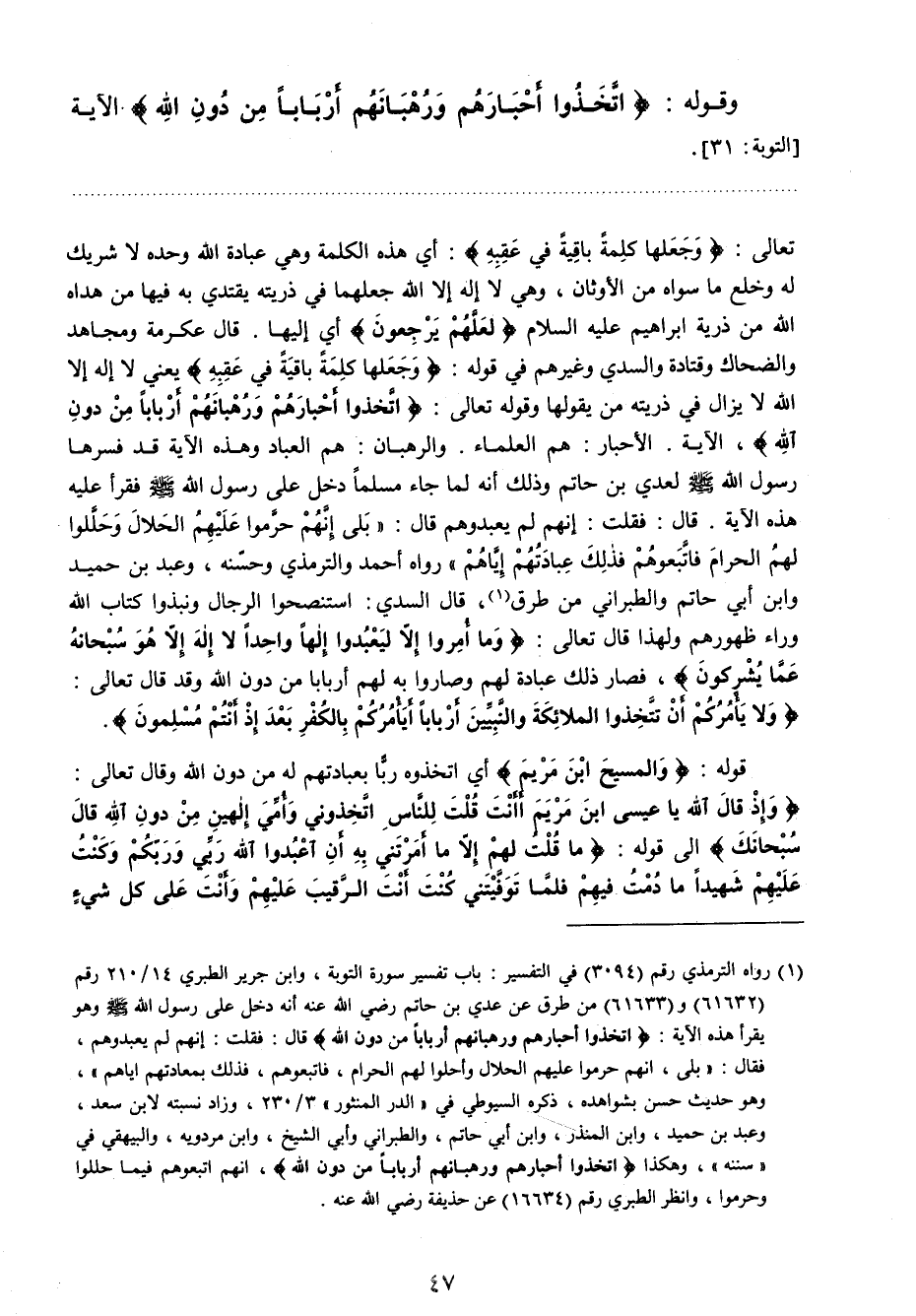 6 رواه الترمذي رقم (3094) في التفسير: باب تفسير سورة التوبة , وابن جرير الطبري 14/ 210 رقم (61632) و (61633) من طرق عن عدي بن حاتم رضي الله عنه أنه دخل على رسول الله صلى الله عليه وسلم وهو يقرأ هذه الآية: (اتخذوا أحبارهم ورهبانهم أربابا من دون الله) قال: فقلت: إنهم لم يعبدوهم فقال: "بلى , إنهم حرموا عليهم الحلال وأحلوا لهم الحرام , فاتبعوهم , فذلك عبادتهم إياهم " , وهو حديث حسن بشواهده , ذكره السيوطي في " الدر المنثور " 3/ 230 , وزاد نسبته لابن سعد وعبد بن حميد , وابن المنذر , وابن أبي حاتم , والطبراني وأبي الشيخ , وابن مردويه , والبيهقي في " سننه ", وهكذا (اتخذوا أحبارهم ورهبانهم اربابا من دون الله) , أنهم اتبعوهم فيما حللوا وحرموا , وانظر الطبري رقم (16634) عن حذيفة رضي الله عنه.