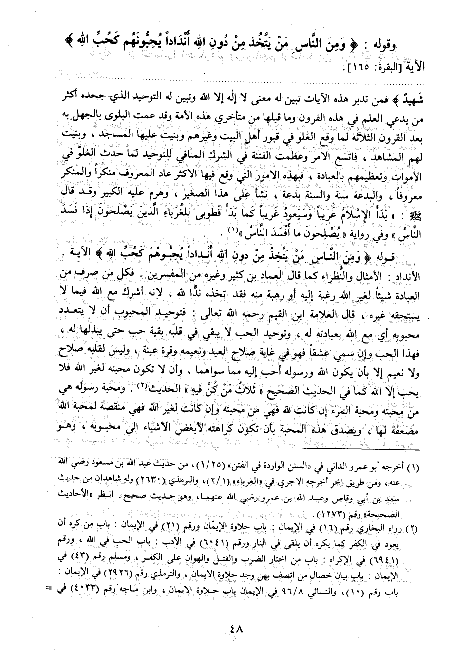 قوله: {وَمِنَ النَّاسِ مَنْ يَتَّخِذُ مِنْ دُونِ اللَّهِ أَنْدَاداً يُحِبُّونَهُمْ كَحُبِّ اللَّهِ} 4 الآية. الأنداد: الأمثال والنظراء كما قال العماد بن كثير وغيره من المفسرين. فكل من صرف من العبادة شيئا لغير الله رغبة إليه أو رهبة منه فقد اتخذه ندا لله؛ لأنه أشرك مع الله فيما لا يستحقه غيره. قال العلامة ابن القيم -رحمه الله تعالى -: فتوحيد المحبوب أن لا يتعدد محبوبه أي مع الله بعبادته له، وتوحيد الحب لا يبقي في قلبه بقية حب حتى يبذلها له، فهذا الحب وإن سمي عشقا فهو في غاية صلاح العبد ونعيمه وقرة عينة، وليس لقلبه صلاح ولا نعيم إلا بأن يكون الله ورسوله أحب إليه مما سواهما، وأن لا تكون محبته لغير الله فلا يحب إلا الله كما في الحديث الصحيح: "ثلاث من كن فيه" الحديث5.