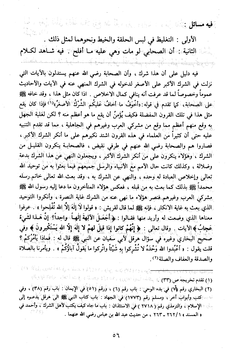 فيه دليل على أن هذا شرك، وأن الصحابة رضي الله عنهم يستدلون بالآيات التي نزلت في الشرك الأكبر على الأصغر لدخوله في الشرك المنهي عنه في الآيات والأحاديث عموما وخصوصا لما قد عرفت أنه ينافي كمال الإخلاص. إذا كان مثل هذا، وقد خافه صلي الله عليه وسلم على الصحابة، كما تقدم في قوله: " أخوف ما أخاف عليكم الشرك الأصغر " 1، فإذا كان يقع مثل هذا في تلك القرون المفضلة، فكيف يؤمن أن يقع ما هو أعظم منه؟ لكن لغلبة الجهل به وقع منهم أعظم مما وقع من مشركي العرب وغيرهم في الجاهلية، مما قد تقدم التنبيه عليه حتى إن كثيرا من العلماء في هذه القرون اشتد نكيرهم على ما أنكر الشرك الأكبر، فصاروا هم والصحابة - رضي الله عنهم - في طرفي نقيض، فالصحابة ينكرون القليل من الشرك، وهؤلاء ينكرون على من أنكر الشرك الأكبر، ويجعلون النهي عن هذا الشرك بدعة وضلالة، وكذلك كانت حال الأمم مع الأنبياء والرسل جميعهم فيما بعثوا به من توحيد الله تعالى وإخلاص العبادة له وحده، والنهي عن الشرك به، وقد بعث الله تعالى خاتم رسله محمدا صلي الله عليه وسلم بذلك كما بعث به من قبله، فعكس هؤلاء المتأخرون ما دعا إليه رسول الله صلي الله عليه وسلم مشركي العرب وغيرهم، فنصر هؤلاء ما نهى عنه من الشرك غاية النصرة، وأنكروا التوحيد الذي بعث به غاية الإنكار، فإنه صلي الله عليه وسلم لما قال لقريش: " قولوا لا إله إلا الله تفلحوا "2 عرفوا معناها الذي وضعت له وأريد منها فقالوا: {أَجَعَلَ الآلِهَةَ إِلَهاً وَاحِداً إِنَّ هَذَا لَشَيْءٌ عُجَابٌ} 3 الآيات. وقال تعالى: {إِنَّهُمْ كَانُوا إِذَا قِيلَ لَهُمْ لا إِلَهَ إِلا اللَّهُ يَسْتَكْبِرُونَ} 4، وفي صحيح البخاري وغيره في سؤال هرقل لأبي سفيان عن النبي صلي الله عليه وسلم قال له: فماذا يأمركم؟ قلت: يقول: "اعبدوا الله وحده لا تشركوا به شيئا واتركوا ما يقول آباؤكم". ويأمرنا بالصلاة والصدقة والعفاف والصلة5.