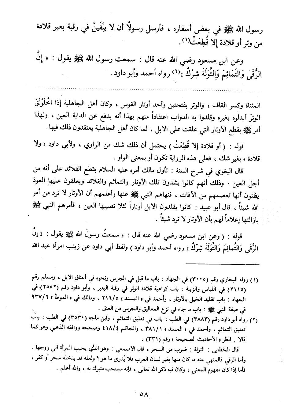 قوله: وعن ابن مسعود رضي الله عنه قال: " سمعت رسول الله صلي الله عليه وسلم يقول: إن الرقى والتمائم والتولة شرك " رواه أحمد وأبو داود " ولفظ أبي داود عن زينب امرأة عبد الله