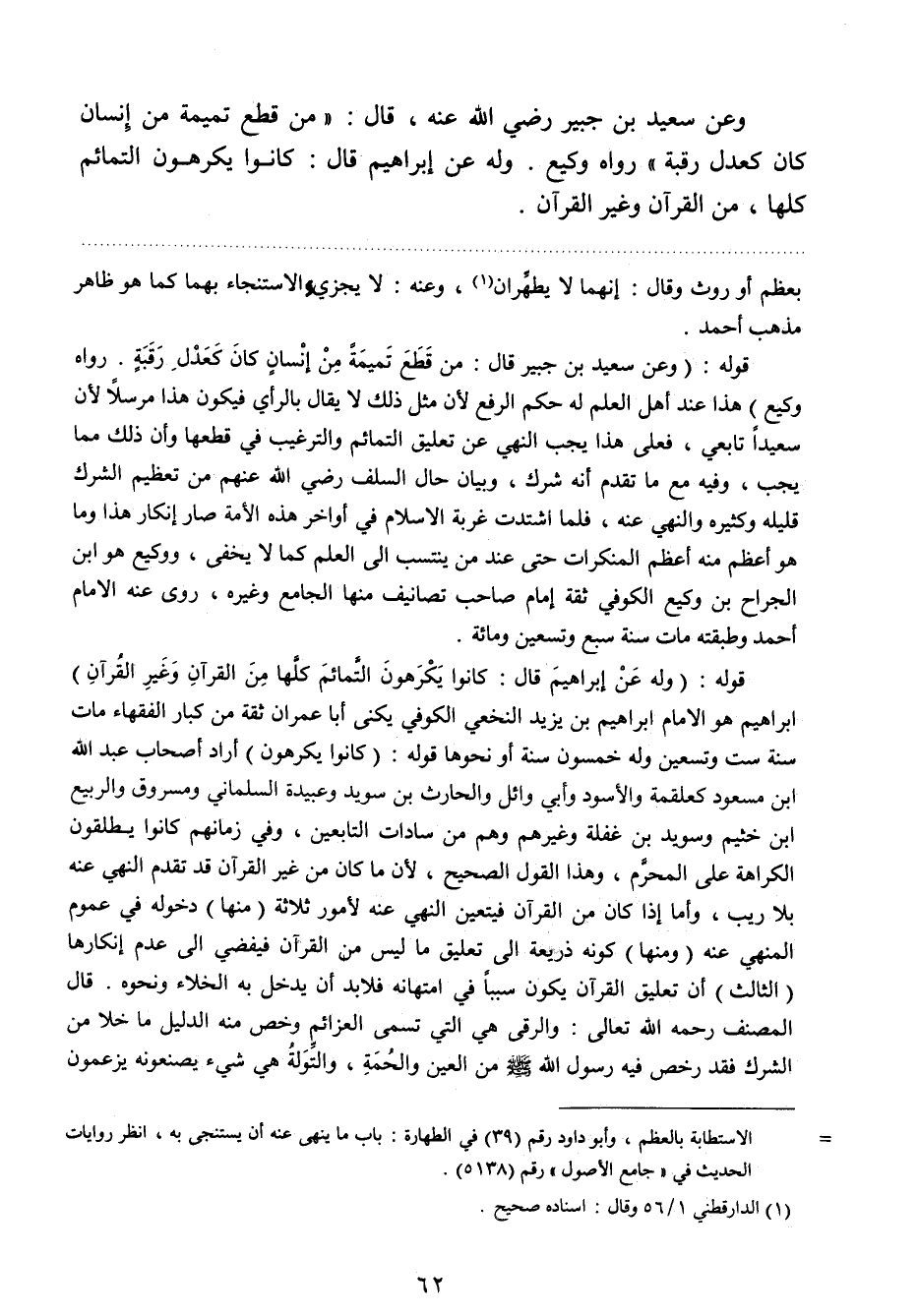 قوله: "وعن سعيد بن جبير قال: " من قطع تميمة من إنسان كان كعدل رقبة "رواه وكيع " هذا عند أهل العلم له حكم الرفع؛ لأن مثل ذلك لا يقال بالرأي فيكون هذا مرسلا؛ لأن سعيدا تابعي، فعلى هذا يجب النهي عن تعليق التمائم والترغيب في قطعها وأن ذلك مما يجب، وفيه مع ما تقدم أنه شرك، وبيان حال السلف - رضي الله عنهم - من تعظيم الشرك قليله وكثيره والنهي عنه، فلما اشتدت غربة الإسلام في أواخر هذه الأمة صار إنكار هذا وما هو أعظم منه أعظم المنكرات حتى عند من ينتسب إلى العلم كما لا يخفى، ووكيع هو ابن الجراح بن وكيع الكوفي ثقة إمام صاحب تصانيف منها الجامع وغيره، روى عنه الإمام أحمد وطبقته مات سنه سبع وتسعين ومائة.