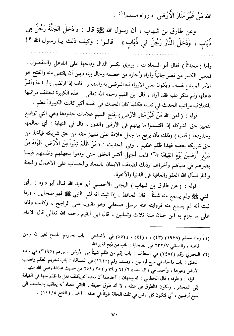 قوله: " لعن الله من غير منار الأرض "بفتح الميم علامات حدودها وهي التي توضع لتمييز حق الشركاء إذا اقتسموا ما بينهم في الأرض والدور، قال في النهاية: أي معالمها وحدودها "قلت " وذلك بأن يرفع ما جعل علامة على تمييز حقه من حق شريكه فيأخذ من حق شريكه بعضه فهذا ظلم عظيم، وفي الحديث: " من ظلم شبرا من الأرض طوقه من سبع أرضين يوم القيامة "2 فما أجهل أكثر الخلق حتى وقعوا بجهلهم وظلمهم فيما يضرهم في دنياهم وأخراهم، وذلك لضعف الإيمان بالمعاد والحساب على الأعمال والجنة والنار نسأل الله العفو والعافية في الدنيا والآخرة.