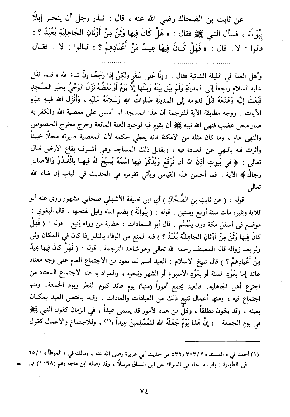 عن ثابت بن الضحاك رضي الله عنه قال: " نذر رجل أن ينحر إبلا ببوانة، فسأل النبي صلي الله عليه وسلم فقال: " هل كان فيها وثن من أوثان الجاهلية يعبد؟ " قالوا: لا. قال: " فهل كان فيها عيد من أعيادهم؟ " قالوا: لا. فقال