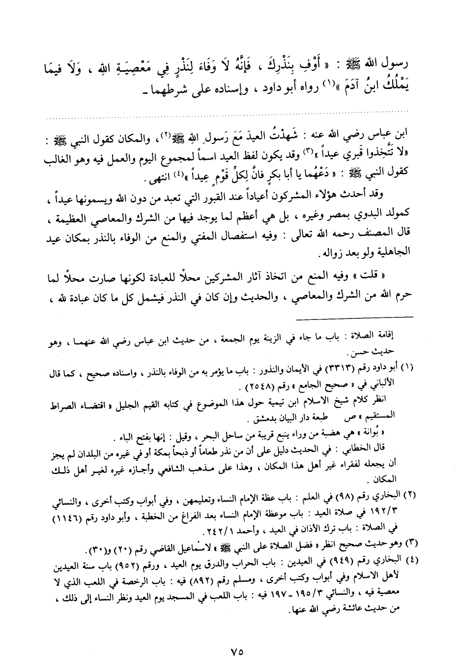ابن عباس:رضي الله عنه شهدت العيد مع رسول الله صلي الله عليه وسلم2 والمكان كقول النبي صلي الله عليه وسلم " لا تتخذوا قبري عيدا "3، وقد يكون لفظ العيد اسما لمجموع اليوم والعمل فيه وهو الغالب كقول النبي صلي الله عليه وسلم " دعهما يا أبا بكر فإن لكل قوم عيدا "4" انتهى.