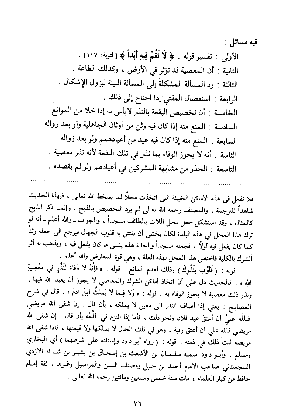 الثامنة: أنه لا يجوز الوفاء بما نذر في تلك البقعة؛ لأنه نذر معصية.