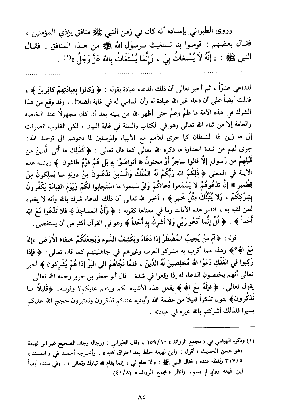 وروى الطبراني بإسناده أنه كان في زمن النبي صلي الله عليه وسلم منافق يؤذي المؤمنين، فقال بعضهم: قوموا بنا نستغيث برسول الله صلي الله عليه وسلم من هذا المنافق. فقال النبي صلي الله عليه وسلم: " إنه لا يستغاث بي، وإنما يستغاث بالله عز وجل " 1.
