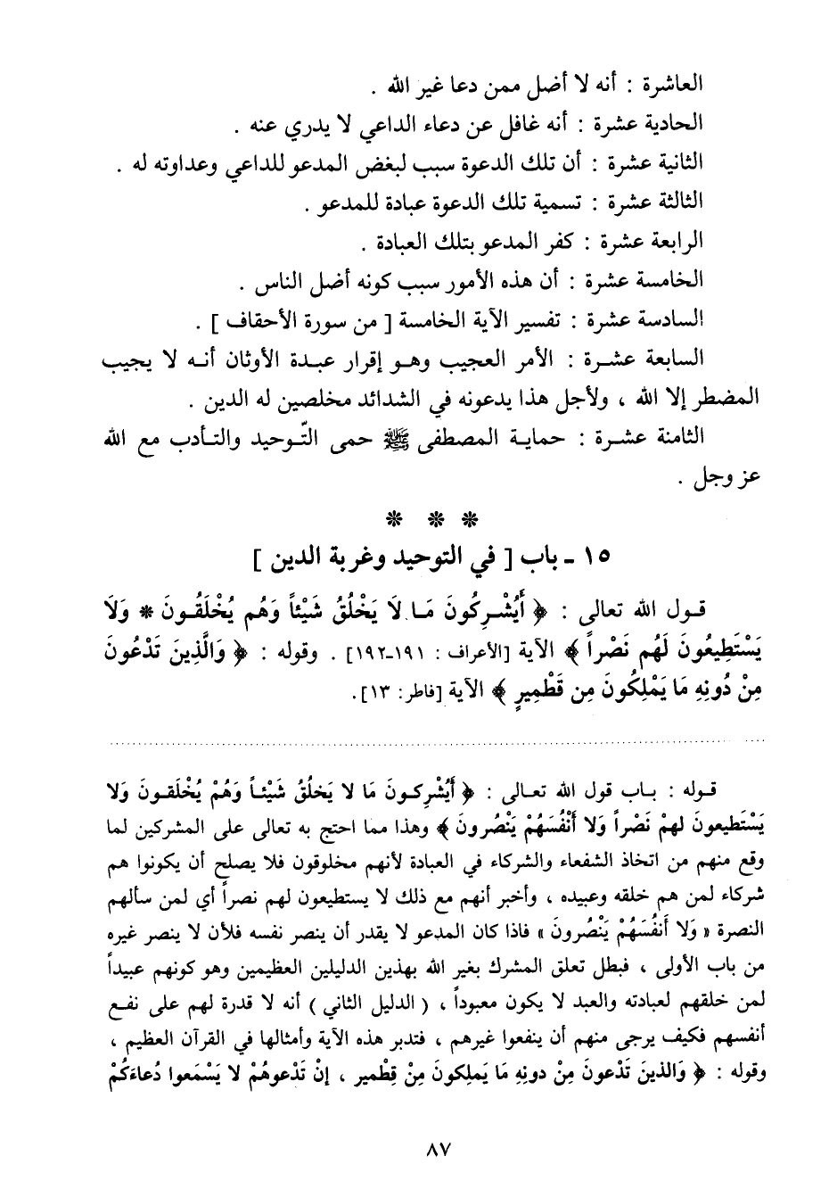 قوله: باب قول الله تعالى: {أَيُشْرِكُونَ مَا لا يَخْلُقُ شَيْئاً وَهُمْ يُخْلَقُونَ. وَلا يَسْتَطِيعُونَ لَهُمْ نَصْراً وَلا أَنْفُسَهُمْ يَنْصُرُونَ} 3. وهذا مما احتج به تعالى على المشركين لما وقع منهم من اتخاذ الشفعاء والشركاء في العبادة؛ لأنهم مخلوقون فلا يصلح أن يكونوا هم شركاء لمن هم خلقه وعبيده، وأخبر أنهم مع ذلك لا يستطيعون لهم نصرا أي لمن سألهم النصرة "ولا أنفسهم ينصرون"، فإذا كان المدعو لا يقدر أن ينصر نفسه فلأن لا ينصر غيره من باب الأولى، فبطل تعلق المشرك بغير الله بهذين الدليلين العظيمين، وهو كونهم عبيدا لمن خلقهم لعبادته والعبد لا يكون معبودا، "الدليل الثاني " أنه لا قدرة لهم على نفع أنفسهم فكيف يرجى منهم أن ينفعوا غيرهم، فتدبر هذه الآية وأمثالها في القرآن العظيم، وقوله: {وَالَّذِينَ تَدْعُونَ مِنْ دُونِهِ مَا يَمْلِكُونَ مِنْ قِطْمِيرٍ، إِنْ تَدْعُوهُمْ لا يَسْمَعُوا دُعَاءَكُمْ