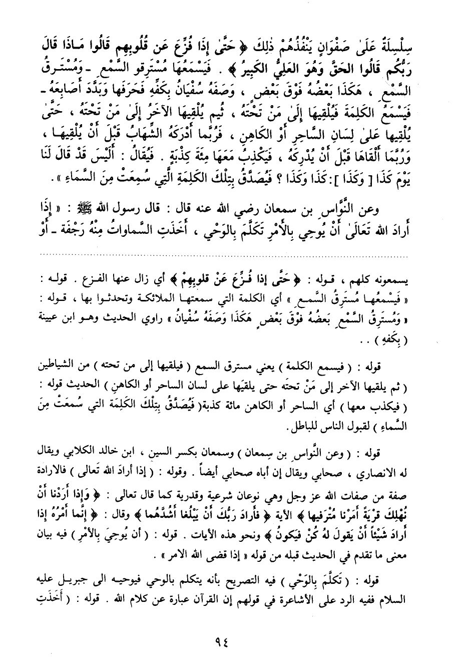 سلسلة على صفوان ينفذهم ذلك {حَتَّى إِذَا فُزِّعَ عَنْ قُلُوبِهِمْ قَالُوا مَاذَا قَالَ رَبُّكُمْ قَالُوا الْحَقَّ وَهُوَ الْعَلِيُّ الْكَبِيرُ} 1. فيسمعها مسترقو السمع- ومسترق السمع، هكذا بعضه فوق بعض، وصفه سفيان بكفه فحرفها وبدد أصابعه- فيسمع الكلمة فيلقيها إلى من تحته، ثم يلقيها الآخر إلى من تحته، حتى يلقيها على لسان الساحر أو الكاهن، فربما أدركه الشهاب قبل أن يلقيها، وربما ألقاها قبل أن يدركه، فيكذب معها مئة كذبة. فيقال: أليس قد قال لنا يوم كذا " وكذا": كذا وكذا؟ فيصدق بتلك الكلمة التي سمعت من السماء ".