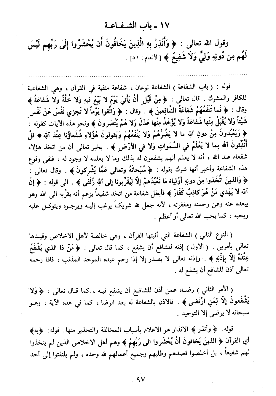 قوله: "باب الشفاعة " الشفاعة نوعان: "النوع الأول " شفاعة منفية في القرآن، وهي الشفاعة للكافر والمشرك. قال تعالى: {مِنْ قَبْلِ أَنْ يَأْتِيَ يَوْمٌ لا بَيْعٌ فِيهِ وَلا خُلَّةٌ وَلا شَفَاعَةٌ} 2، وقال: {فَمَا تَنْفَعُهُمْ شَفَاعَةُ الشَّافِعِينَ} 3، وقال: {وَاتَّقُوا يَوْماً لا تَجْزِي نَفْسٌ عَنْ نَفْسٍ شَيْئاً وَلا يُقْبَلُ مِنْهَا شَفَاعَةٌ وَلا يُؤْخَذُ مِنْهَا عَدْلٌ وَلا هُمْ يُنْصَرُونَ} 4، ونحو هذه الآيات كقوله: {وَيَعْبُدُونَ مِنْ دُونِ اللَّهِ مَا لا يَضُرُّهُمْ وَلا يَنْفَعُهُمْ وَيَقُولُونَ هَؤُلاءِ شُفَعَاؤُنَا عِنْدَ اللَّهِ قُلْ أَتُنَبِّئُونَ اللَّهَ بِمَا لا يَعْلَمُ فِي السَّمَاوَاتِ وَلا فِي الأَرْضِ} 5. يخبر تعالى أن من اتخذ هؤلاء شفعاء عند الله، أنه لا يعلم أنهم يشفعون له بذلك وما لا يعلمه لا وجود له، فنفى وقوع هذه الشفاعة، وأخبر أنها شرك بقوله: {سُبْحَانَهُ وَتَعَالَى عَمَّا يُشْرِكُونَ} 6. وقال تعالى: {وَالَّذِينَ اتَّخَذُوا مِنْ دُونِهِ أَوْلِيَاءَ مَا نَعْبُدُهُمْ إِلَّا لِيُقَرِّبُونَا إِلَى اللَّهِ زُلْفَى} 7 إلى قوله: {إِنَّ اللَّهَ لا يَهْدِي مَنْ هُوَ كَاذِبٌ كَفَّارٌ} 8. فأبطل شفاعة من اتخذ شفيعا يزعم أنه يقربه إلى الله وهو يبعده عنه وعن رحمته ومغفرته؛ لأنه جعل لله شريكا يرغب إليه ويرجوه ويتوكل عليه ويحبه، كما يحب الله تعالى أو أعظم.