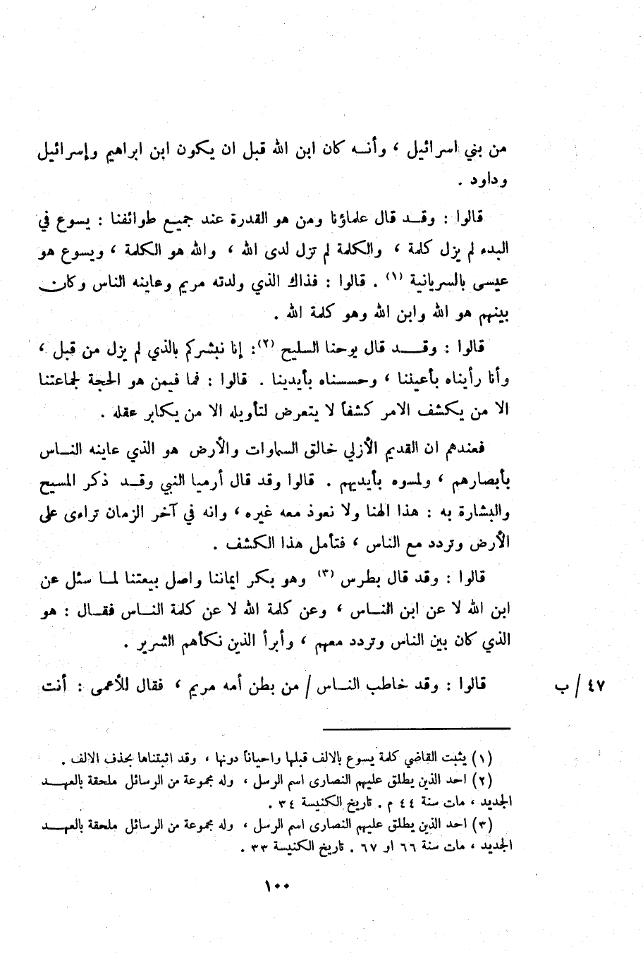 فعندهم ان القديم الأزلي خالق السماوات والأرض هو الذي عاينه الناس بأبصارهم، ولمسوه بأيديهم. قالوا وقد قال أرميا النبي وقد ذكر المسيح والبشارة به: هذا الهنا ولا نعوذ معه غيره، وانه في آخر الزمان تراءى على الأرض وتردد مع الناس، فتأمل هذا الكشف.