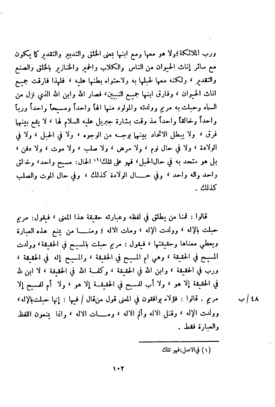 ورب الملائكة؛ ولا هو معها ومع ابنها بمعنى الخلق والتدبير والتقدير كما يكون مع سائر إناث الحيوان من الناس والكلاب والحمير والخنازير بالخلق والصنع والتقدير، ولكنه معها لحبلها به ولاحتواء بطنها عليه، فلهذا فارقت جميع اناث الحيوان، وفارق ابنها جميع النبيين، فصار الله وابن الله الذي نزل من السماء وحبلت به مريم وولدته والمولود منها الها واحدا ومسيحا واحدا وربا واحدا وخالقا واحدا مذ وقت بشارة جبريل عليه السلام لها، لا يقع بينهما فرق، ولا يبطل الاتحاد بينهما بوجه من الوجوه، ولا في الحبل، ولا في الولادة، ولا في حال نوم، ولا مرض، ولا صلب، ولا موت، ولا دفن، بل هو متحد به في حال الحبل، فهو على تلك «1» الحال: مسيح واحد، وخالق واحد واله واحد، وفي حال الولادة كذلك، وفي حال الموت والصلب كذلك.