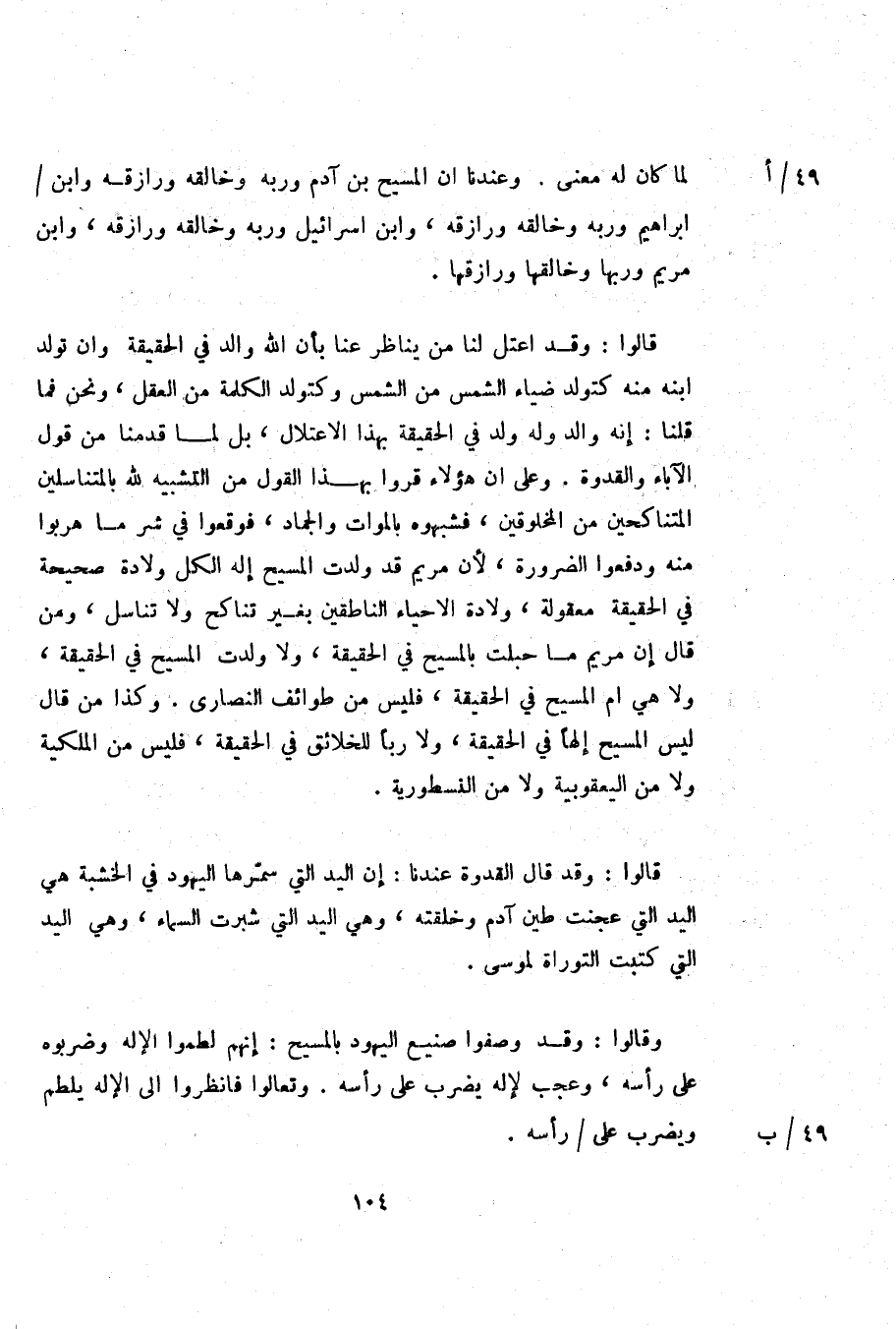 قالوا: وقد اعتل لنا من يناظر عنا بأن الله والد في الحقيقة وان تولد ابنه منه كتولد ضياء الشمس من الشمس وكتولد الكلمة من العقل، ونحن فما قلنا: إنه والد وله ولد في الحقيقة بهذا الاعتلال، بل لما قدمنا من قول الآباء والقدوة. وعلى ان هؤلاء قروا بهذا القول من التشبيه لله بالمتناسلين المتناكحين من المخلوقين، فشبهوه بالموات والجماد، فوقعوا في شر ما هربوا منه ودفعوا الضرورة، لأن مريم قد ولدت المسيح إله الكل ولادة صحيحة في الحقيقة معقولة، ولادة الاحياء الناطقين بغير تناكح ولا تناسل، ومن قال إن مريم ما حبلت بالمسيح في الحقيقة، ولا ولدت المسيح في الحقيقة، ولا هي ام المسيح في الحقيقة، فليس من طوائف النصارى. وكذا من قال ليس المسيح إلها في الحقيقة، ولا ربا للخلائق في الحقيقة، فليس من الملكية ولا من اليعقوبية ولا من النسطورية.