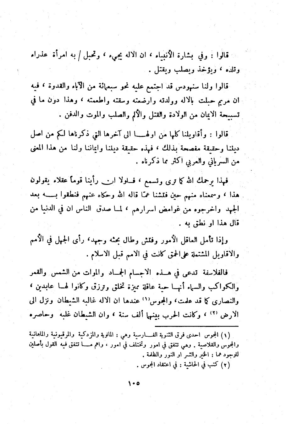 (1) المجوس احدى فرق الثنوية الفارسية وهي: المانوية والمزدكية والمرقيونية والماهانية والمجوس والقلاصية. وهي تتفق في امور وتختلف في امور، واهم ما تتفق فيه القول بأصلين للوجود هما: الخير والشر او النور والظلمة.