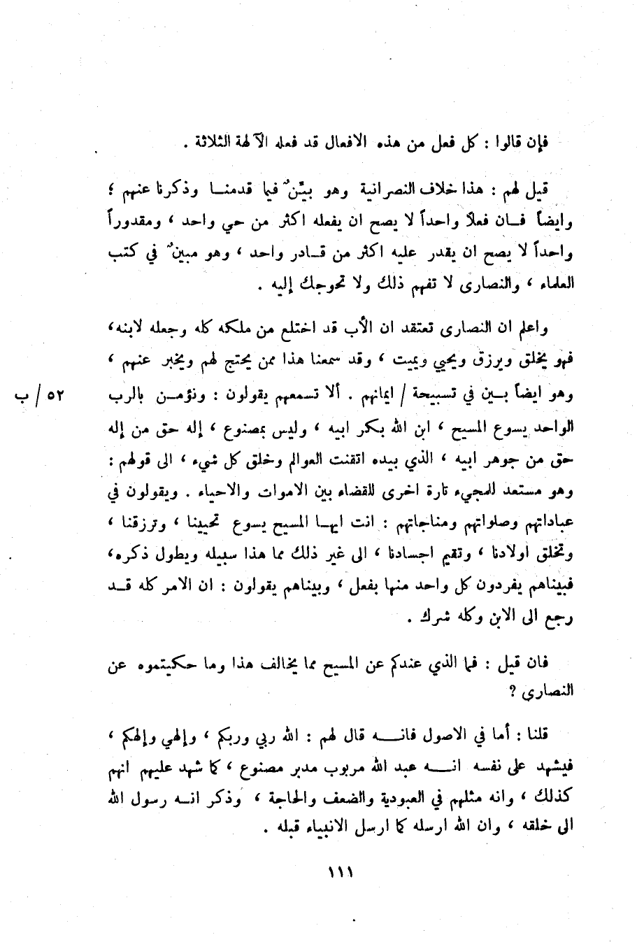 قيل لهم: هذا خلاف النصرانية وهو بيّن فيما قدمنا وذكرنا عنهم؛ وايضا فان فعلا واحدا لا يصح ان يفعله اكثر من حي واحد، ومقدورا واحدا لا يصح ان يقدر عليه اكثر من قادر واحد، وهو مبين في كتب العلماء، والنصارى لا تفهم ذلك ولا تحوجك إليه.
