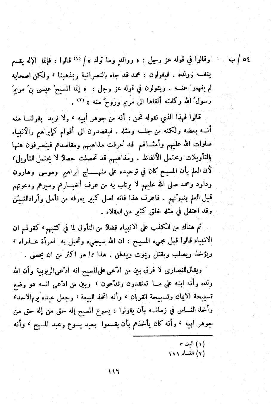 وقالوا في قوله عز وجل: «وَوالِدٍ وَما وَلَدَ» / «1» قالوا: فإنما الإله يقسم بنفسه وولده. فيقولون: محمد قد جاء بالنصرانية وبمذهبنا، ولكن اصحابه لم يفهموا عنه. ويقولون في قوله عز وجل: «إِنَّمَا الْمَسِيحُ عِيسَى ابْنُ مَرْيَمَ رَسُولُ اللَّهِ وَكَلِمَتُهُ أَلْقاها إِلى مَرْيَمَ وَرُوحٌ مِنْهُ» «2» .