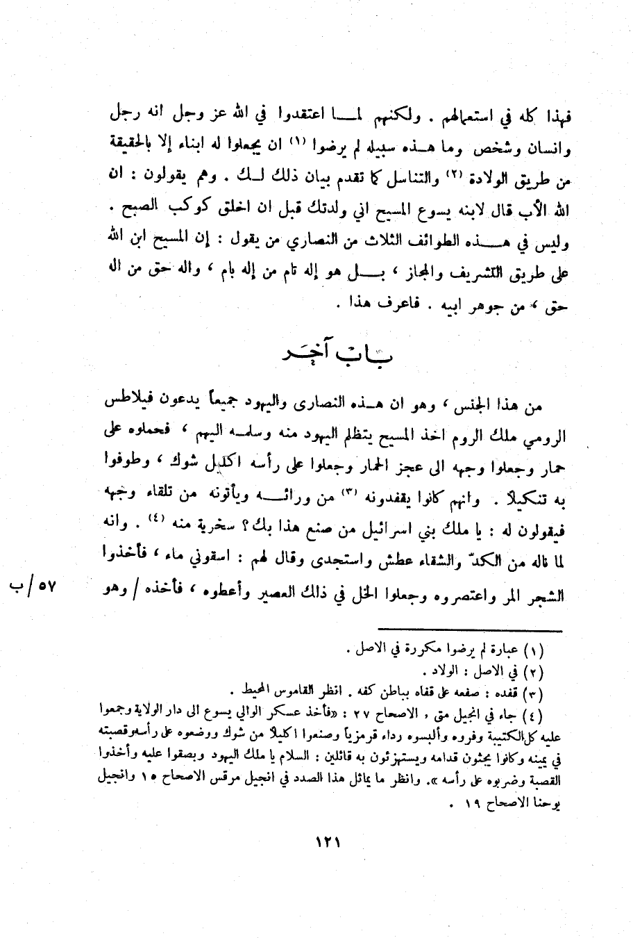 باب آخر [ما جاء به الرسول حول الزعم بصلب المسيح، واختلاف النصارى حول الاناجيل، وتأثر المجتمعات النصرانية بعقائد الروم واخلاقهم]