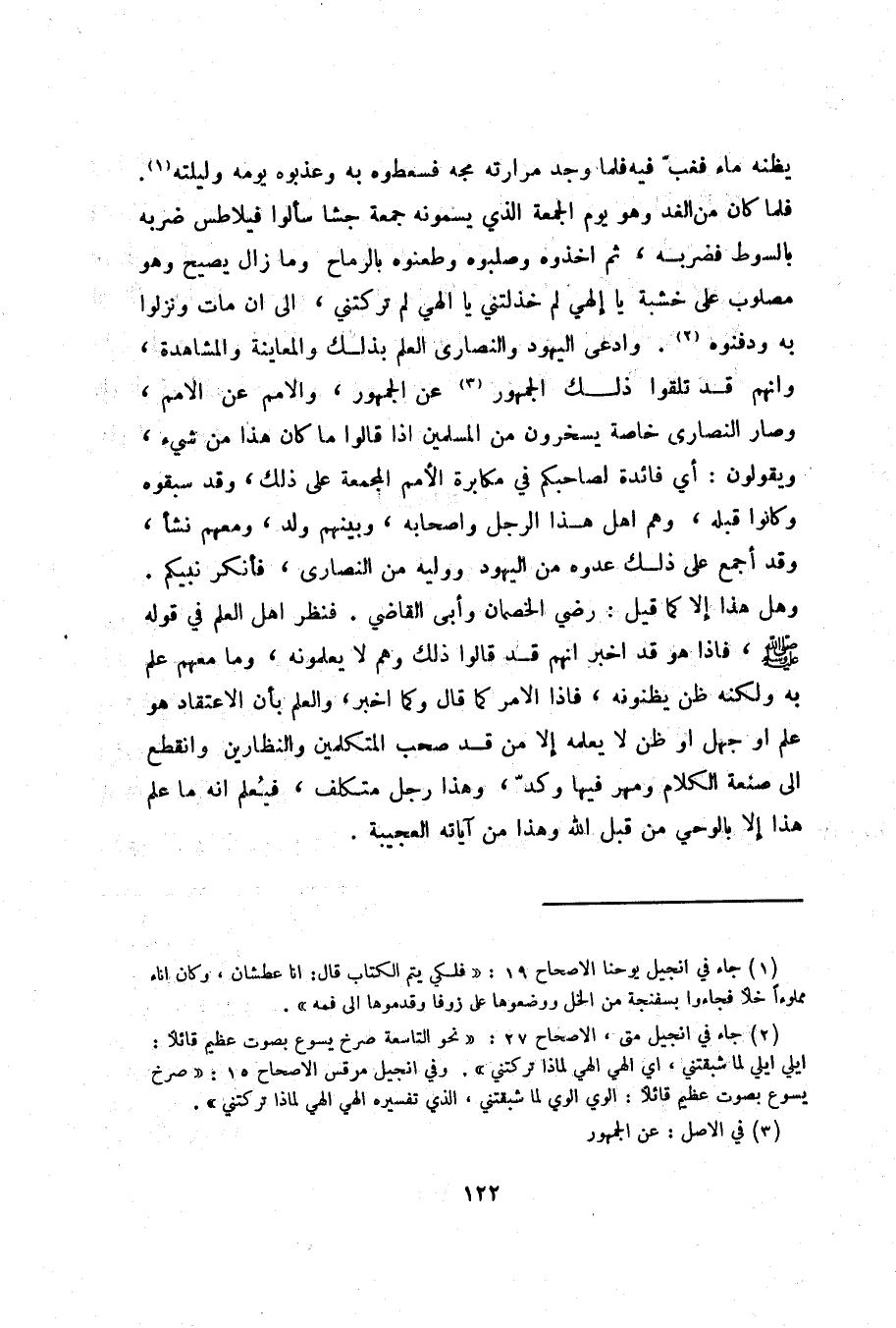 فلما كان من الغد وهو يوم الجمعة الذي يسمونه جمعة جشا سألوا فيلاطس ضربه بالسوط فضربه، ثم اخذوه وصلبوه وطعنوه بالرماح وما زال يصيح وهو مصلوب على خشبة يا إلهي لم خذلتني يا الهي لم تركتني، الى ان مات ونزلوا به ودفنوه «2» . وادعى اليهود والنصارى العلم بذلك والمعاينة والمشاهدة، وانهم قد تلقوا ذلك الجمهور «3» عن الجمهور، والامم عن الامم، وصار النصارى خاصة يسخرون من المسلمين اذا قالوا ما كان هذا من شيء، ويقولون: أي فائدة لصاحبكم في مكابرة الأمم المجمعة على ذلك، وقد سبقوه وكانوا قبله، وهم اهل هذا الرجل واصحابه، وبينهم ولد، ومعهم نشأ، وقد أجمع على ذلك عدوه من اليهود ووليه من النصارى، فأنكر نبيكم.