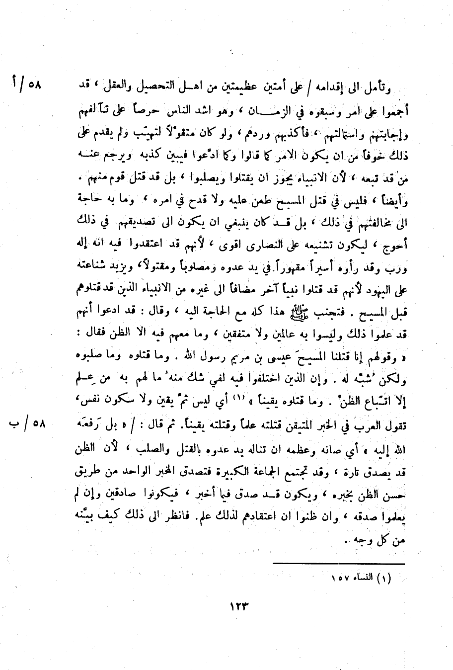 «وَقَوْلِهِمْ إِنَّا قَتَلْنَا الْمَسِيحَ عِيسَى ابْنَ مَرْيَمَ رَسُولَ اللَّهِ. وَما قَتَلُوهُ وَما صَلَبُوهُ وَلكِنْ شُبِّهَ لَهُمْ. وَإِنَّ الَّذِينَ اخْتَلَفُوا فِيهِ لَفِي شَكٍّ مِنْهُ ما لَهُمْ بِهِ مِنْ عِلْمٍ إِلَّا اتِّباعَ الظَّنِّ. وَما قَتَلُوهُ يَقِيناً» «1» أي ليس ثمّ يقين ولا سكون نفس، تقول العرب في الخبر المتيقن قتلته علما وقتلته يقينا. ثم قال: «بَلْ رَفَعَهُ اللَّهُ إِلَيْهِ» أي صانه وعظمه ان تناله يد عدوه بالقتل والصلب، لأن الظن قد يصدق تارة، وقد تجتمع الجماعة الكبيرة فتصدق المخبر الواحد من طريق حسن الظن بخبره، ويكون قد صدق فيما أخبر، فيكونوا صادقين وإن لم يعلموا صدقه، وان ظنوا ان اعتقادهم لذلك علم. فانظر الى ذلك كيف بيّنه من كل وجه.