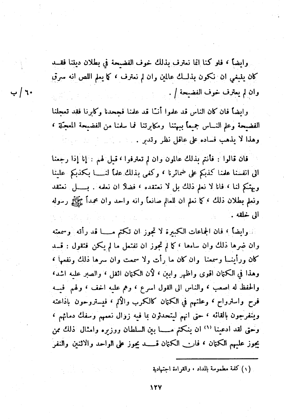 وايضا، فان الجماعات الكبيرة لا تجوز ان تكتم ما قد رأته وسمعته وان ضرها ذلك وان ساءها، كما لم تجوز ان تفتعل ما لم يكن فتقول: قد كان ورأينا وسمعنا وان كان ما رأت ولا سمعت وان سرها ذلك ونفعها، وهذا في الكتمان اقوى واظهر وابين، لأن الكتمان اثقل، والصبر عليه اشد، والحفظ له اصعب، والناس الى القول اسرع، وهم عليه اخف، ولهم فيه فرح واسترواح، وعلتهم في الكتمان كالكرب والألم، فيستروحون باذاعته وينفرجون بالقائه، حتى انهم ليتحدثون بما فيه زوال نعمهم وسفك دمائهم، وحتى لقد ادعينا «1» ان ينكتم ما بين السلطان ووزيره وامثال ذلك ممن يجوز عليهم الكتمان، فان الكتمان قد يجوز على الواحد والاثنين والنفر
