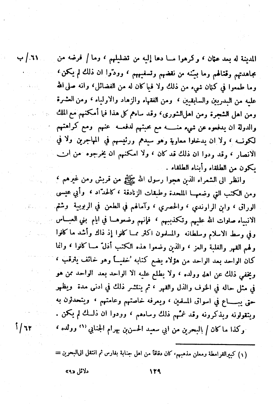 وانظر الى الشعراء الذين هجوا رسول الله صلّى الله عليه وسلم من قريش ومن غيرهم، ومن الكتب التي وضعها الملحدة وطبقات الزنادقة، كالحدّاد، وأبي عيسى الوراق، وابن الراوندي، والحصري، وآمالهم في الطعن في الربوبية وشتم الانبياء صلوات الله عليهم وتكذيبهم، فإنهم وضعوها في ايام بني العباس وفي وسط الاسلام وسلطانه والمسلمون اكثر مما كانوا إذ ذاك وأشد ما كانوا ولهم القهر والغلبة والعز، والذين وضعوا هذه الكتب أذلّ ما كانوا، وانما كان الواحد بعد الواحد من هؤلاء يضع كتابه خفيا وهو خائف يترقب، ويخفي ذلك عن اهله وولده، ولا يطلع عليه الا الواحد بعد الواحد ممن هو في مثل حاله في الخوف والذل والقهر، ثم ينتشر ذلك في ادنى مدة ويظهر حتى يباع في اسواق المسلمين، ويعرفه خاصتهم وعامتهم، ويتحدثون به ويتقولونه ويذكرونه وقد غمّهم ذلك وساءهم، وودوا ان ذلك لم يكن.
