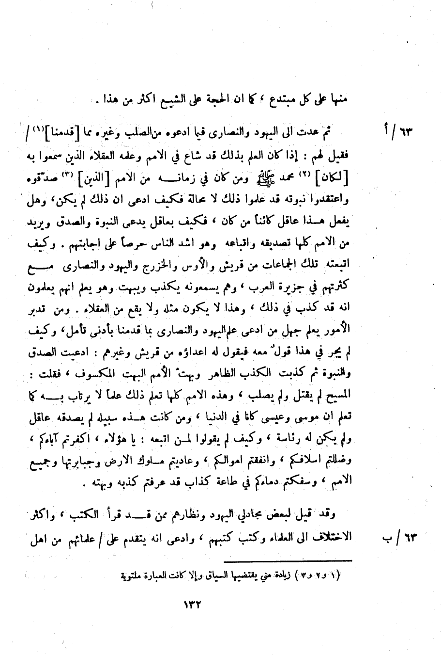 المسيح لم يقتل ولم يصلب، وهذه الامم كلها تعلم ذلك علما لا يرتاب به كما تعلم ان موسى وعيسى كانا في الدنيا، ومن كانت هذه سبيله لم يصدقه عاقل ولم يكن له رئاسة، وكيف لم يقولوا لمن اتبعه: يا هؤلاء، اكفرتم آباءكم، وضللتم اسلافكم، وانفقتم اموالكم، وعاديتم ملوك الارض وجبابرتها وجميع الامم، وسفكتم دماءكم في طاعة كذاب قد عرفتم كذبه وبهته.