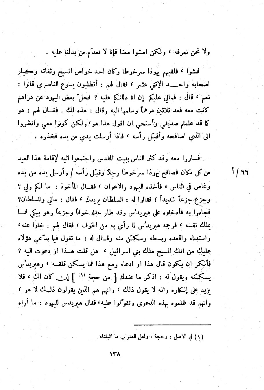 فساروا معه وقد كثر الناس ببيت المقدس واجتمعوا اليه لإقامة هذا العيد من كل مكان فصافح يهوذا سرخوطا رجلا وقبّل رأسه/ وأرسل يده من يده وغاص في الناس، فأخذه اليهود والاعوان، فقال المأخوذ: ما لكم ولي؟