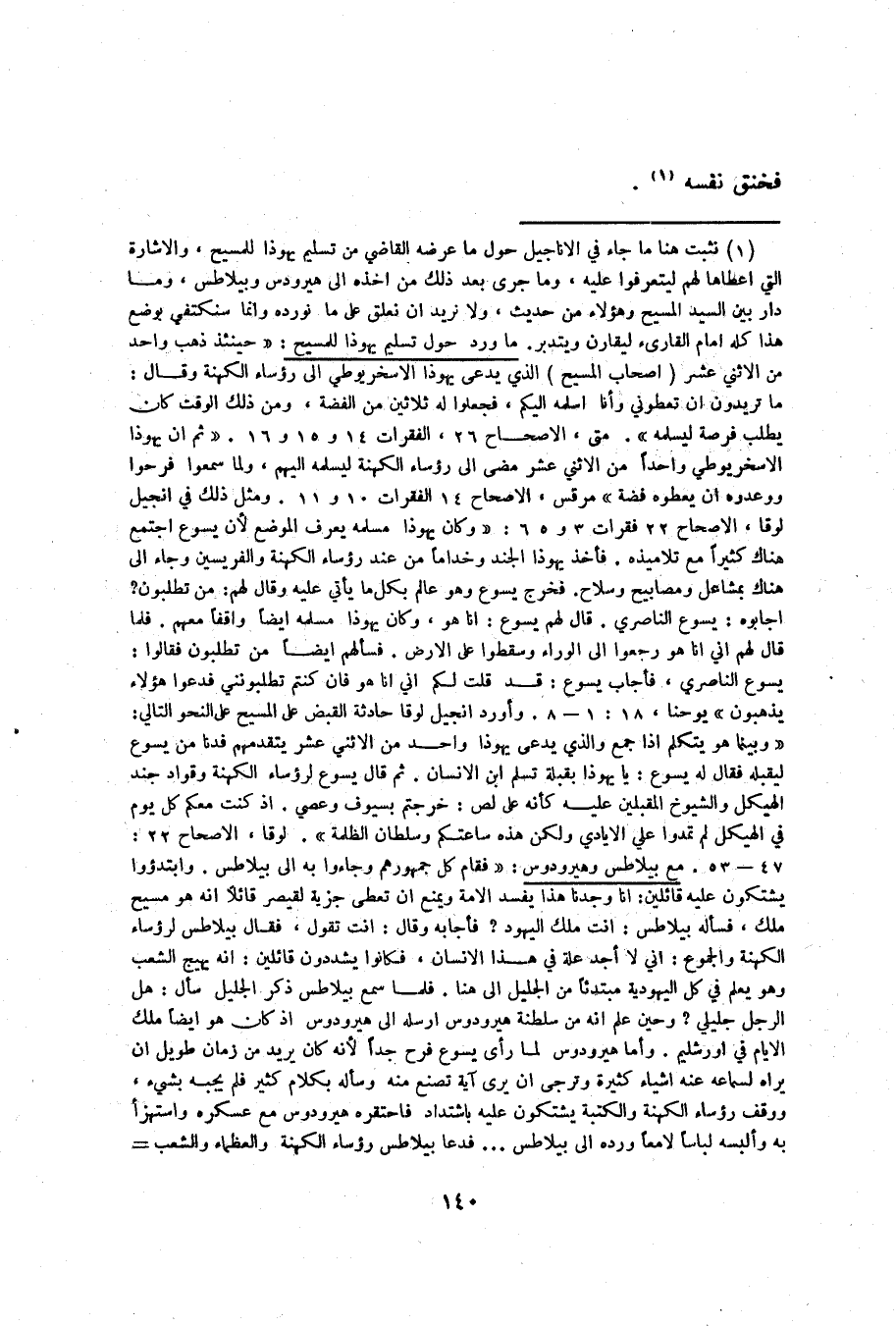 (1) نثبت هنا ما جاء في الاناجيل حول ما عرضه القاضي من تسليم يهوذا للمسيح، والاشارة التي اعطاها لهم ليتعرفوا عليه، وما جرى بعد ذلك من اخذه الى هيرودس وبيلاطس، وما دار بين السيد المسيح وهؤلاء من حديث، ولا نريد ان نعلق على ما نورده وانما سنكتفي بوضع هذا كله امام القارىء ليقارن ويتدبر. ما ورد حول تسليم يهوذا للمسيح: «حينئذ ذهب واحد من الاثني عشر (اصحاب المسيح) الذي يدعى يهوذا الاسخريوطي الى رؤساء الكهنة وقال: ما تريدون ان تعطوني وأنا اسلمه اليكم، فجعلوا له ثلاثين من الفضة، ومن ذلك الوقت كان يطلب فرصة ليسلمه» . متى، الاصحاح 26، الفقرات 14 و 15 و 16. «ثم ان يهوذا الاسخريوطي واحدا من الاثني عشر مضى الى رؤساء الكهنة ليسلمه اليهم، ولما سمعوا فرحوا ووعدوه ان يعطوه فضة» مرقس، الاصحاح 14 الفقرات 10 و 11. ومثل ذلك في انجيل لوقا، الاصحاح 22 فقرات 3 و 65: «وكان يهوذا مسلمه يعرف الموضع لأن يسوع اجتمع هناك كثيرا مع تلاميذه. فأخذ يهوذا الجند وخداما من عند رؤساء الكهنة والفريسين وجاء الى هناك بمشاعل ومصابيح وسلاح. فخرج يسوع وهو عالم بكل ما يأتي عليه وقال لهم: من تطلبون؟ اجابوه: يسوع الناصري. قال لهم يسوع: انا هو، وكان يهوذا مسلمه ايضا واقفا معهم. فلما قال لهم اني انا هو رجعوا الى الوراء وسقطوا على الارض. فسألهم ايضا من تطلبون فقالوا: يسوع الناصري، فأجاب يسوع: قد قلت لكم اني انا هو فان كنتم تطلبونني فدعوا هؤلاء يذهبون» يوحنا، 18: 1- 8. وأورد انجيل لوقا حادثة القبض على المسيح على النحو التالي: «وبينما هو يتكلم اذا جمع والذي يدعى يهوذا واحد من الاثني عشر يتقدمهم فدنا من يسوع ليقبله فقال له يسوع: يا يهوذا بقبلة تسلم ابن الانسان. ثم قال يسوع لرؤساء الكهنة وقواد جند الهيكل والشيوخ المقبلين عليه كأنه على لص: خرجتم بسيوف وعصي. اذ كنت معكم كل يوم في الهيكل لم تمدوا علي الايادي ولكن هذه ساعتكم وسلطان الظلمة» . لوقا، الاصحاح 22: 47- 53. مع بيلاطس وهيرودوس: «فقام كل جمهورهم وجاؤا به الى بيلاطس. وابتدؤوا يشتكون عليه قائلين: انا وجدنا هذا يفسد الامة ويمنع ان تعطى جزية لقيصر قائلا انه هو مسيح ملك، فسأله بيلاطس: انت ملك اليهود؟ فأجابه وقال: انت تقول، فقال بيلاطس لرؤساء الكهنة والجموع: اني لا أجد علة في هذا الانسان، فكانوا يشددون قائلين: انه يهيج الشعب وهو يعلم في كل اليهودية مبتدئا من الجليل الى هنا. فلما سمع بيلاطس ذكر الجليل سأل: هل الرجل جليلي؟ وحين علم انه من سلطنة هيرودوس ارسله الى هيرودوس اذ كان هو ايضا ملك الايام في اورشليم. وأما هيرودوس لما رأى يسوع فرح جدا لأنه كان يريد من زمان طويل ان يراه لسماعه عنه اشياء كثيرة وترجى ان يرى آية تصنع منه وسأله بكلام كثير فلم يجبه بشيء، ووقف رؤساء الكهنة والكتبة يشتكون عليه باشتداد فاحتقره هيرودوس مع عسكره واستهزأ به وألبسه لباسا لامعا ورده الى بيلاطس ... فدعا بيلاطس رؤساء الكهنة والعظماء والشعب-