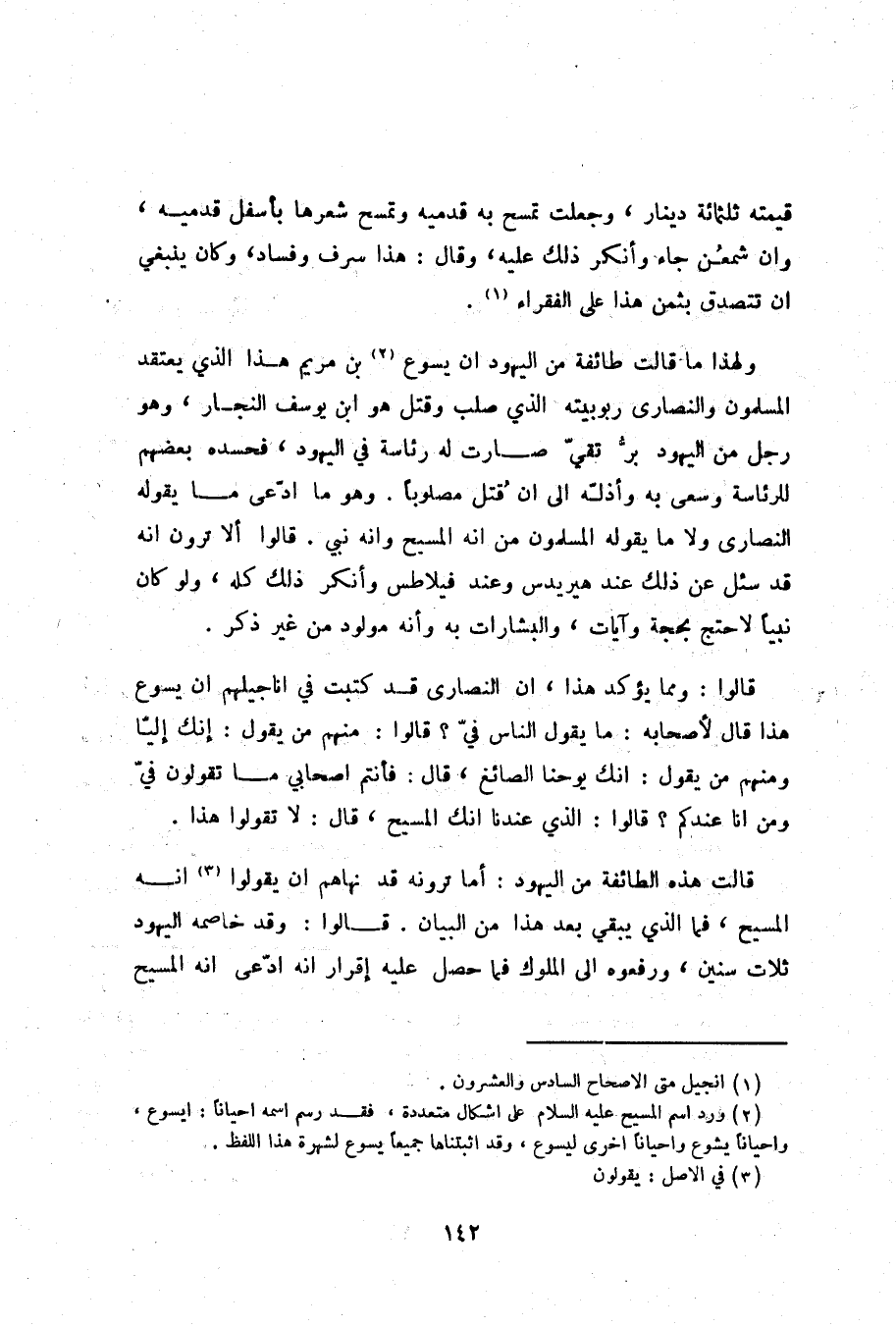 ولهذا ما قالت طائفة من اليهود ان يسوع «2» بن مريم هذا الذي يعتقد المسلمون والنصارى ربوبيته الذي صلب وقتل هو ابن يوسف النجار، وهو رجل من اليهود برّ تقيّ صارت له رئاسة في اليهود، فحسده بعضهم للرئاسة وسعى به وأذلّه الى ان قتل مصلوبا. وهو ما ادّعى ما يقوله النصارى ولا ما يقوله المسلمون من انه المسيح وانه نبي. قالوا ألا ترون انه قد سئل عن ذلك عند هيريدس وعند فيلاطس وأنكر ذلك كله، ولو كان نبيا لاحتج بحجة وآيات، والبشارات به وأنه مولود من غير ذكر.