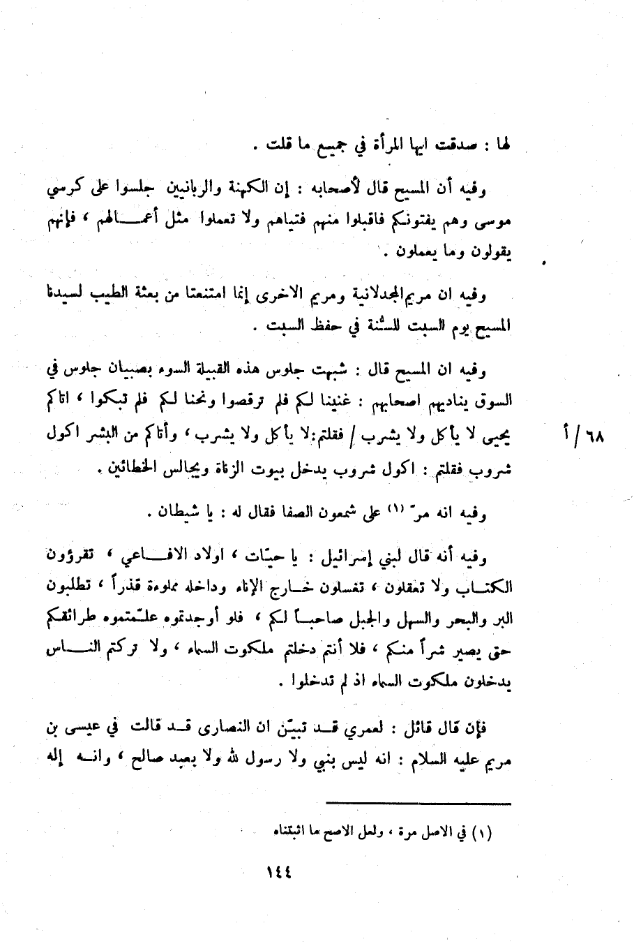 وفيه ان المسيح قال: شبهت جلوس هذه القبيلة السوء بصبيان جلوس في السوق يناديهم اصحابهم: غنينا لكم فلم ترقصوا ونحنا لكم فلم تبكوا، اتاكم يحيى لا يأكل ولا يشرب/ فقلتم: لا يأكل ولا يشرب، وأتاكم من البشر اكول شروب فقلتم: اكول شروب يدخل بيوت الزناة ويجالس الخطائين.