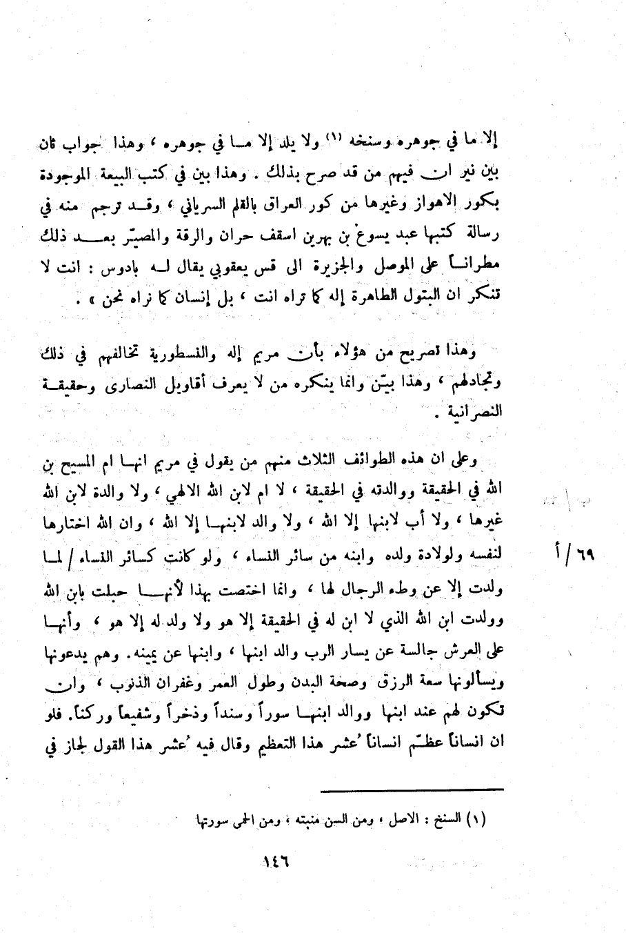 إلا ما في جوهره وسنخه «1» ولا يلد إلا ما في جوهره، وهذا جواب ثان بين نيران فيهم من قد صرح بذلك. وهذا بين في كتب البيعة الموجودة بكور الاهواز وغيرها من كور العراق بالقلم السرياني، وقد ترجم منه في رسالة كتبها عبد يسوع بن بهرين اسقف حران والرقة والمصيّر بعد ذلك مطرانا على الموصل والجزيرة الى قس يعقوبي يقال له بادوس: انت لا تنكر ان البتول الطاهرة إله كما تراه انت، بل إنسان كما نراه نحن» .