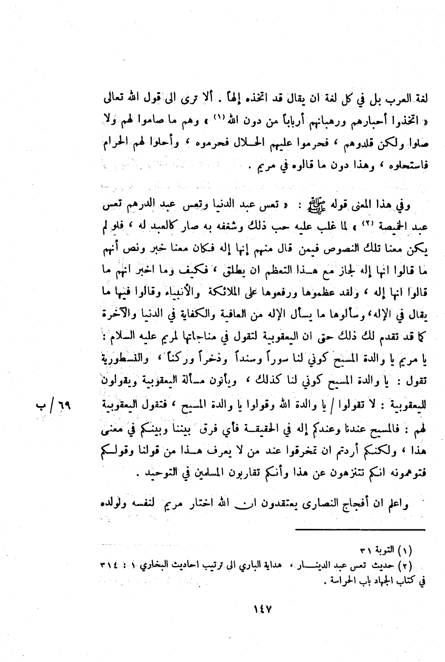 وفي هذا المعنى قوله صلّى الله عليه وسلم: «تعس عبد الدنيا وتعس عبد الدرهم تعس عبد الخميصة «2» » لما غلب عليه حب ذلك وشغفه به صار كالعبد له، فلو لم يكن معنا تلك النصوص فيمن قال منهم إنها إله فكان معنا خبر ونص أنهم ما قالوا انها إله لجاز مع هذا التعظم ان يطلق، فكيف وما اخبر انهم ما قالوا انها إله، ولقد عظموها ورفعوها على الملائكة والأنبياء وقالوا فيها ما يقال في الإله، وسألوها ما يسأل الإله من العافية والكفاية في الدنيا والآخرة كما قد تقدم لك ذلك حتى ان اليعقوبية لتقول في مناجاتها لمريم عليه السلام: