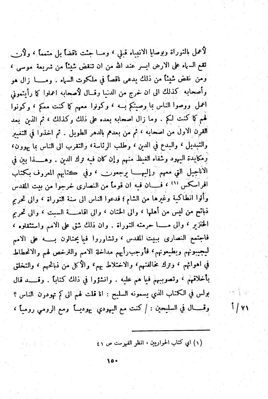لأعمل بالتوراة وبوصايا الانبياء قبلي، وما جئت ناقضا بل متمما، ولأن تقع السماء على الارض ايسر عند الله من ان تنقض شيئا من شريعة موسى، ومن نقض شيئا من ذلك يدعى ناقصا في ملكوت السماء. وما زال هو وأصحابه كذلك الى ان خرج من الدنيا وقال لأصحابه اعملوا كما رأيتموني اعمل ووصوا الناس بما وصيتكم به، وكونوا معهم كما كنت معكم، وكونوا لهم كما كنت لكم. وما زال اصحابه بعده على ذلك وكذلك، ثم الذين بعد القرن الاول من اصحابه، ثم من بعدهم بالدهر الطويل. ثم اخذوا في التغيير والتبديل، والبدع في الدين، وطلب الرئاسة، والتقرب الى الناس بما يهوون، ومكايدة اليهود وشفاء الغيظ منهم وإن كان فيه ترك الدين. وهذا بين في الاناجيل التي معهم وإليها يرجعون، وفي كتابهم المعروف بكتاب افراسكس «1» ، فان فيه ان قوما من النصارى خرجوا من بيت المقدس وأتوا انطاكية وغيرها من الشام؛ فدعوا الناس الى سنة التوراة، والى تحريم ذبائح من ليس من أهلها، والى الختان، والى اقامة السبت، والى تحريم الخنزير، والى ما حرمته التوراة. وان ذلك شق على الامم واستثقلوه، فاجتمع النصارى ببيت المقدس، وتشاوروا فيما يحتالون به على الامم ليجيبونهم ويطيعونهم، فأوجب رأيهم مداخلة الامم والترخص لهم والانحطاط في اهوائهم، وترك مخالفتهم، والاختلاط بهم، والأكل من ذبائحهم، والتخلق بأخلاقهم، وتصويبهم فيما هم عليه. وانشؤوا في ذلك كتابا. وقد قال بولس في الكتاب الذي يسمونه السليح: انا قلت لهم الى كم تهودون الناس؟