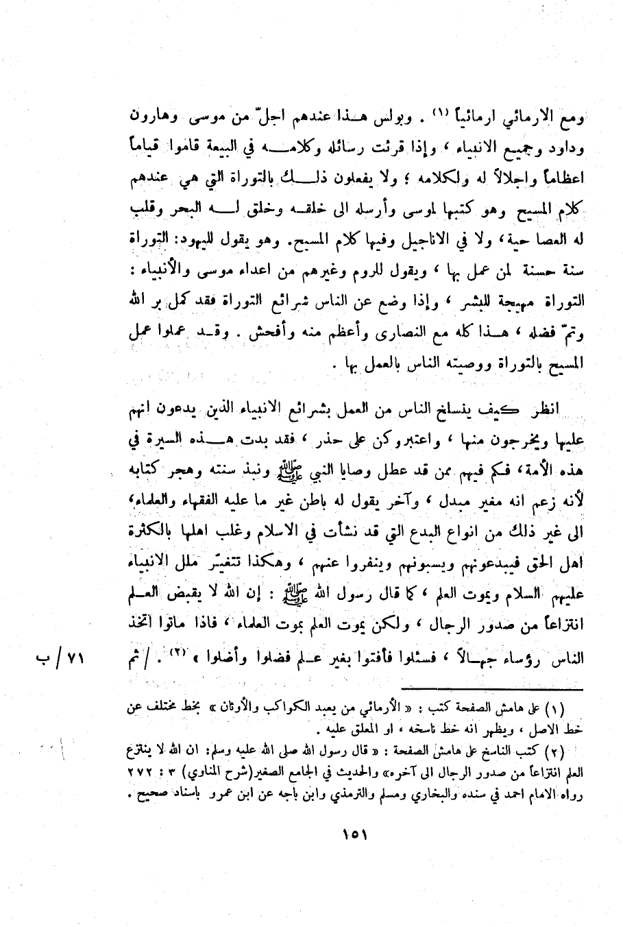 (1) على هامش الصفحة كتب: «الأرمائي من يعبد الكواكب والأوثان» بخط مختلف عن خط الاصل، ويظهر انه خط ناسخه، او المعلق عليه.