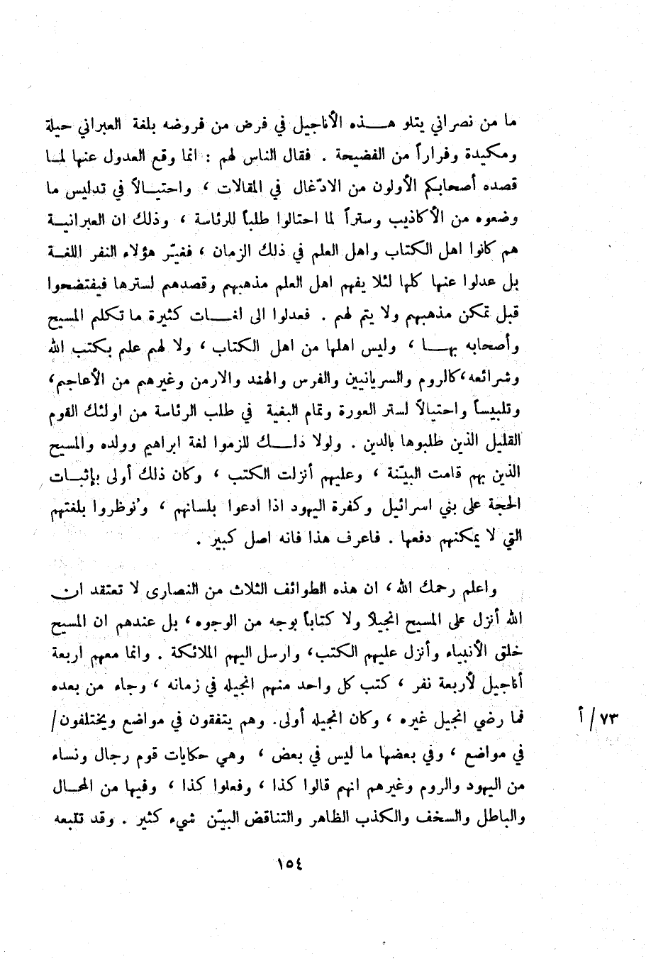 ما من نصراني يتلو هذه الأناجيل في فرض من فروضه بلغة العبراني حيلة ومكيدة وفرارا من الفضيحة. فقال الناس لهم: انما وقع العدول عنها لما قصده أصحابكم الأولون من الادّغال في المقالات، واحتيالا في تدليس ما وضعوه من الأكاذيب وسترا لما احتالوا طلبا للرئاسة، وذلك ان العبرانية هم كانوا اهل الكتاب واهل العلم في ذلك الزمان، فغيّر هؤلاء النفر اللغة بل عدلوا عنها كلها لئلا يفهم اهل العلم مذهبهم وقصدهم لسترها فيفتضحوا قبل تمكن مذهبهم ولا يتم لهم. فعدلوا الى لغات كثيرة ما تكلم المسيح وأصحابه بها، وليس اهلها من اهل الكتاب، ولا لهم علم بكتب الله وشرائعه، كالروم والسريانيين والفرس والهند والارمن وغيرهم من الأعاجم، وتلبيسا واحتيالا لستر العورة وتمام البغية في طلب الرئاسة من اولئك القوم القليل الذين طلبوها بالدين. ولولا دلك للزموا لغة ابراهيم وولده والمسيح الذين بهم قامت البيّنة، وعليهم أنزلت الكتب، وكان ذلك أولى بإثبات الحجة على بني اسرائيل وكفرة اليهود اذا ادعوا بلسانهم، ونوظروا بلغتهم التي لا يمكنهم دفعها. فاعرف هذا فانه اصل كبير.
