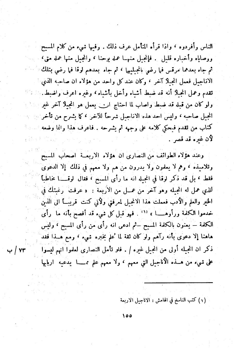 وعند هؤلاء الطوائف من النصارى ان هؤلاء الاربعة اصحاب المسيح وتلاميذه، وهم لا يعلمون ولا يدرون من هم ولا معهم في ذلك إلا الدعوى فقط، بل قد ذكر لوقا في انجيله انه ما رأى المسيح، فقال لوقا مخاطبا للذي عمل له انجيله وهو آخر من عمل من الاربعة: «عرفت رغبتك في الخير والعلم والأدب فعملت هذا الانجيل لمعرفتي ولأني كنت قريبا الى الذين خدموا الكلمة ورأوها» «1» . فهو قبل كل شيء قد أفصح بأنه ما رأى الكلمة- يعنون بالكلمة المسيح- ثم ادعى انه رأى من رأى المسيح، وليس هاهنا إلا دعوى بأنه رآهم ولو كان ثقة لما علم بخبره شيء، ومع هذا فقد ذكر ان انجيله أولى من انجيل غيره/. فلو تأمل النصارى لعلموا انهم ليسوا على شيء من هذه الأناجيل التي معهم، ولا معهم علم مما يدعيه اربابها