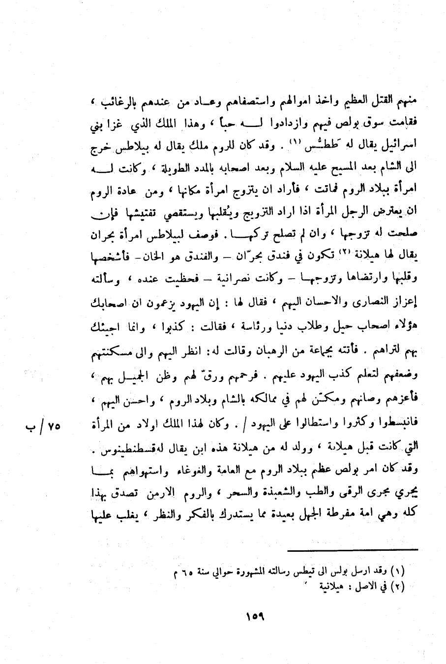 منهم القتل العظيم واخذ اموالهم واستصفاهم وعاد من عندهم بالرغائب، فقامت سوق بولص فيهم وازدادوا له حبا، وهذا الملك الذي غزا بني اسرائيل يقال له ططّس «1» . وقد كان للروم ملك يقال له بيلاطس خرج الى الشام بعد المسيح عليه السلام وبعد اصحابه بالمدد الطويلة، وكانت له امرأة ببلاد الروم فماتت، فأراد ان يتزوج امرأة مكانها، ومن عادة الروم ان يعترض الرجل المرأة اذا اراد التزويج ويقلبها ويستقصي تفتيشها فإن صلحت له تزوجها، وان لم تصلح تركها. فوصف لبيلاطس امرأة بحران يقال لها هيلانة «2» تكون في فندق بحرّان- والفندق هو الخان- فأشخصها وقلبها وارتضاها وتزوجها- وكانت نصرانية- فحظيت عنده، وسألته إعزاز النصارى والاحسان اليهم، فقال لها: إن اليهود يزعمون ان اصحابك هؤلاء اصحاب حيل وطلاب دنيا ورئاسة، فقالت: كذبوا، وانما اجيئك بهم لتراهم. فأنته بجماعة من الرهبان وقالت له: انظر اليهم والى مسكنتهم وضعفهم لتعلم كذب اليهود عليهم. فرحمهم ورقّ لهم وظن الجميل بهم، فأعزهم وصانهم ومكّن لهم في ممالكه بالشام وبلاد الروم، واحسن اليهم، فانبسطوا وكثروا واستطالوا على اليهود/. وكان لهذا الملك اولاد من المرأة التي كانت قبل هيلانة، وولد له من هيلانة هذه ابن يقال له قسطنطينوس.