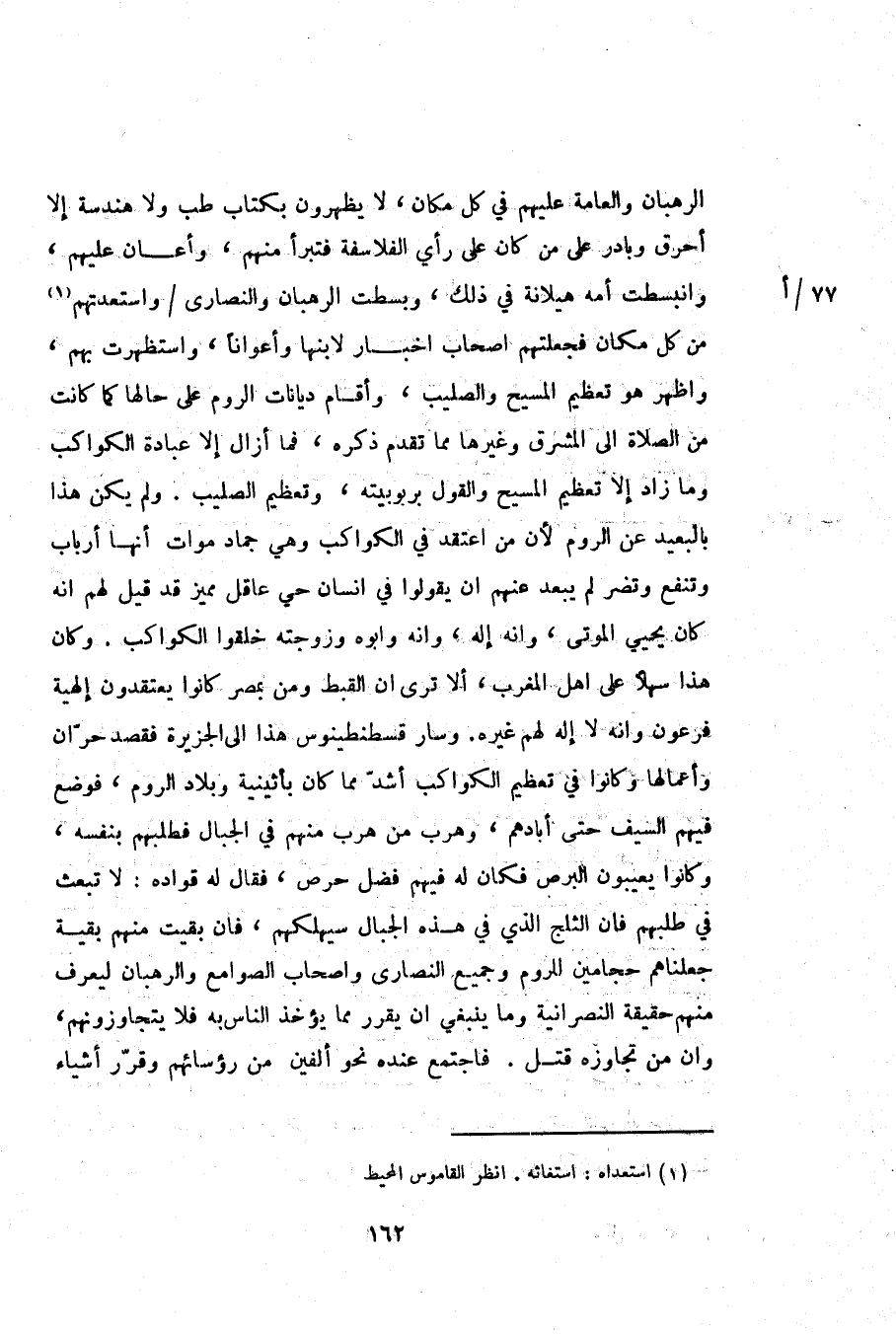 الرهبان والعامة عليهم في كل مكان، لا يظهرون بكتاب طب ولا هندسة إلا أحرق وبادر على من كان على رأي الفلاسفة فتبرأ منهم، وأعان عليهم، وانبسطت أمه هيلانة في ذلك، وبسطت الرهبان والنصارى/ واستعدتهم «1» من كل مكان فجعلتهم اصحاب اخبار لابنها وأعوانا، واستظهرت بهم، واظهر هو تعظيم المسيح والصليب، وأقام ديانات الروم على حالها كما كانت من الصلاة الى المشرق وغيرها مما تقدم ذكره، فما أزال إلا عبادة الكواكب وما زاد إلا تعظيم المسيح والقول بربوبيته، وتعظيم الصليب. ولم يكن هذا بالبعيد عن الروم لأن من اعتقد في الكواكب وهي جماد موات أنها أرباب وتنفع وتضر لم يبعد عنهم ان يقولوا في انسان حي عاقل مميز قد قيل لهم انه كان يحيي الموتى، وانه إله، وانه وابوه وزوجته خلقوا الكواكب. وكان هذا سهلا على اهل المغرب، ألا ترى ان القبط ومن بمصر كانوا يعتقدون إلهية فرعون وانه لا إله لهم غيره. وسار قسطنطينوس هذا الى الجزيرة فقصد حرّان وأعمالها وكانوا في تعظيم الكواكب أشدّ مما كان بأثينية وبلاد الروم، فوضع فيهم السيف حتى أبادهم، وهرب من هرب منهم في الجبال فطلبهم بنفسه، وكانوا يعيبون البرص فكان له فيهم فضل حرص، فقال له قواده: لا تبعث في طلبهم فان الثلج الذي في هذه الجبال سيهلكهم، فان بقيت منهم بقية جعلناهم حجامين للروم وجميع النصارى واصحاب الصوامع والرهبان ليعرف منهم حقيقة النصرانية وما ينبغي ان يقرر مما يؤخذ الناس به فلا يتجاوزونهم، وان من تجاوزه قتل. فاجتمع عنده نحو ألفين من رؤسائهم وقرّر أشياء