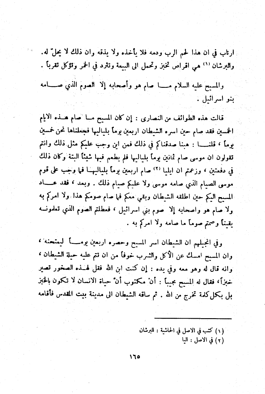 وفي انجيلهم ان الشيطان اسر المسيح وحصره اربعين يوما ليمتحنه، وان المسيح امسك عن الأكل والشرب خوفا من ان تتم عليه حيلة الشيطان، وانه قال له وهو معه وفي يده: إن كنت ابن الله فقل لهذه الصخور تصير خبزا، فقال له المسيح مجيبا: أن مكتوب أنّ حياة الانسان لا تكون بالخبز بل بكل كلمة تخرج من الله. ثم ساقه الشيطان الى مدينة بيت المقدس فأقامه