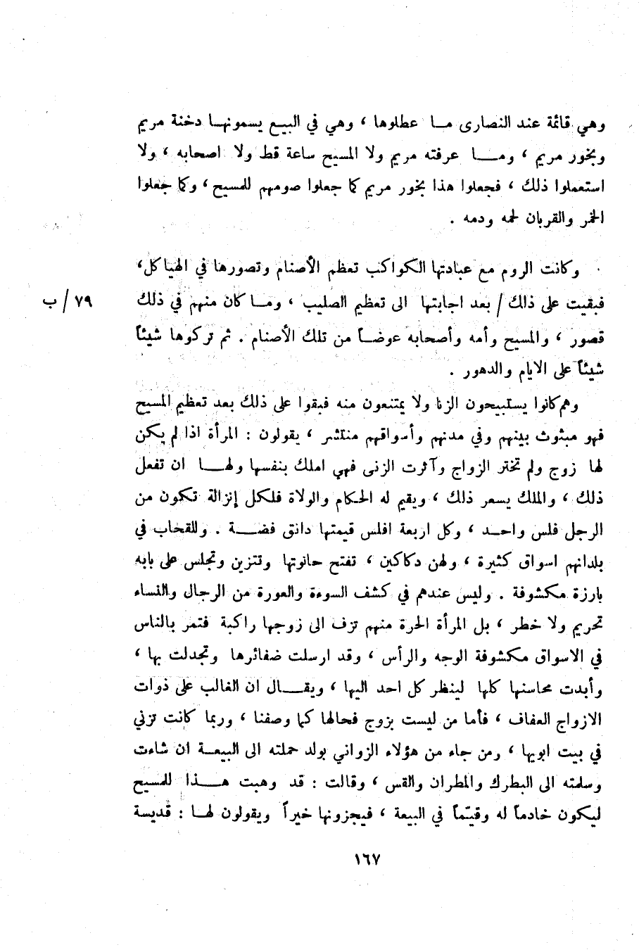 وهم كانوا يستبيحون الزنا ولا يمتنعون منه فبقوا على ذلك بعد تعظيم المسيح فهو مبثوث بينهم وفي مدنهم وأسواقهم منتشر، يقولون: المرأة اذا لم يكن لها زوج ولم تختر الزواج وآثرت الزنى فهي املك بنفسها ولها ان تفعل ذلك، والملك يسعر ذلك، ويقيم له الحكام والولاة فلكل إنزالة تكون من الرجل فلس واحد، وكل اربعة افلس قيمتها دانق فضة. وللقحاب في بلدانهم اسواق كثيرة، ولهن دكاكين، تفتح حانوتها وتتزين وتجلس على بابه بارزة مكشوفة. وليس عندهم في كشف السوءة والعورة من الرجال والنساء تحريم ولا خطر، بل المرأة الحرة منهم تزف الى زوجها راكبة فتمر بالناس في الاسواق مكشوفة الوجه والرأس، وقد ارسلت ضفائرها وتجدلت بها، وأبدت محاسنها كلها لينظر كل احد اليها، ويقال ان الغالب على ذوات الازواج العفاف، فأما من ليست بزوج فحالها كما وصفنا، وربما كانت تزني في بيت ابويها، ومن جاء من هؤلاء الزواني بولد حملته الى البيعة ان شاءت وسلمته الى البطرك والمطران والقس، وقالت: قد وهبت هذا للمسيح ليكون خادما له وقيّما في البيعة، فيجزونها خيرا ويقولون لها: قديسة