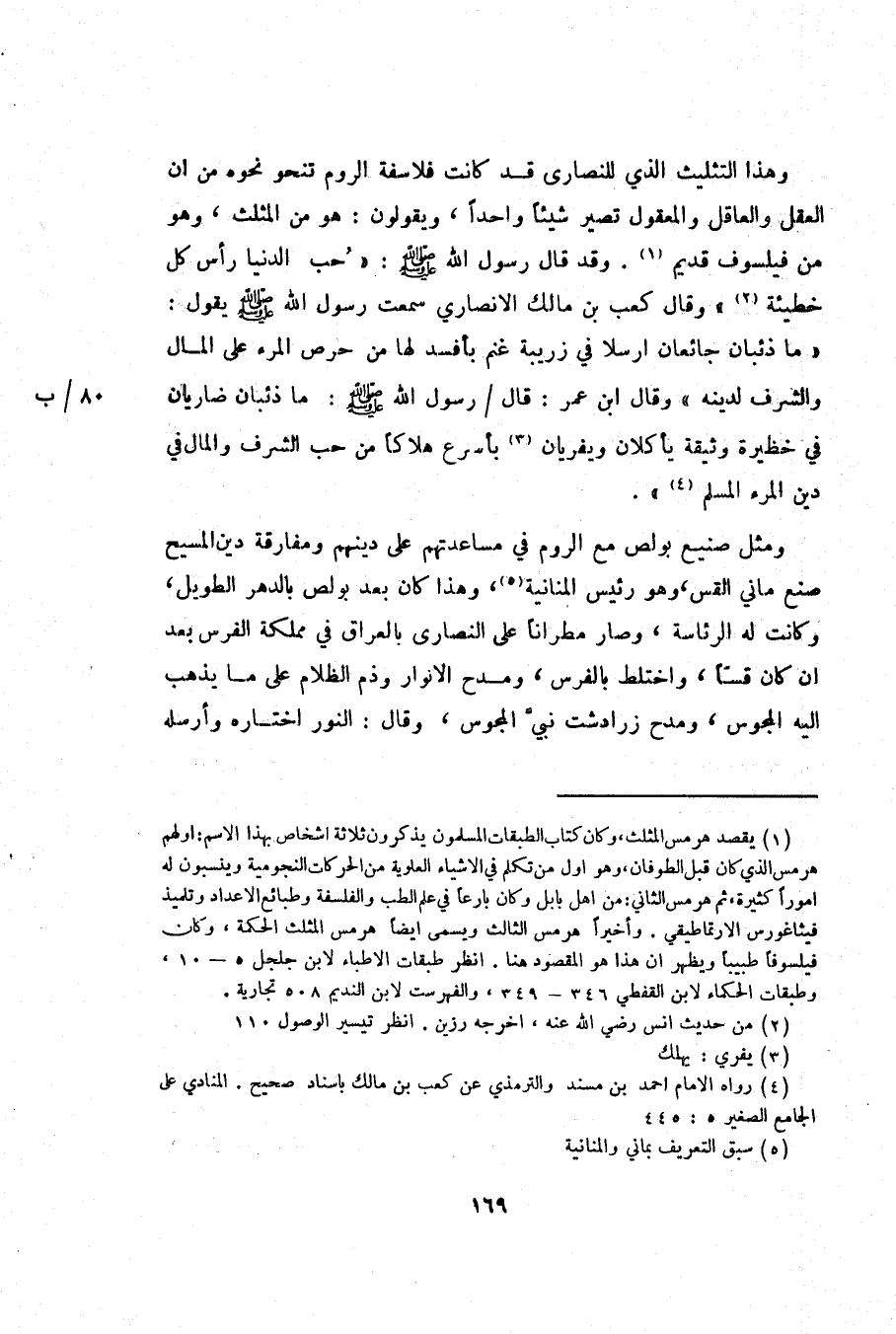 وهذا التثليث الذي للنصارى قد كانت فلاسفة الروم تنحو نحوه من ان العقل والعاقل والمعقول تصير شيئا واحدا، ويقولون: هو من المثلث، وهو من فيلسوف قديم «1» . وقد قال رسول الله صلّى الله عليه وسلم: «حب الدنيا رأس كل خطيئة «2» » وقال كعب بن مالك الانصاري سمعت رسول الله صلّى الله عليه وسلم يقول: