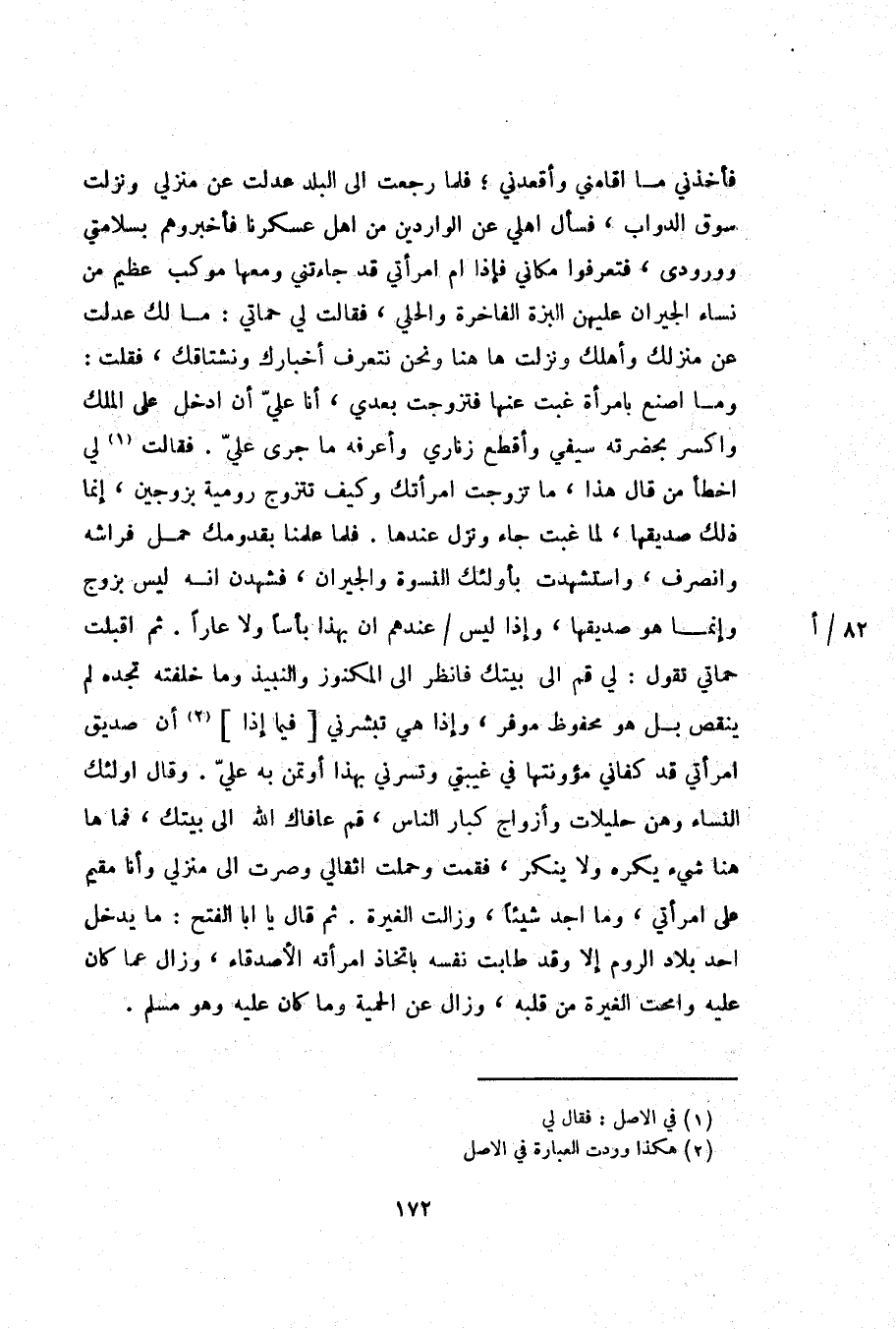 وما اصنع بامرأة غبت عنها فتزوجت بعدي، أنا عليّ أن ادخل على الملك واكسر بحضرته سيفي وأقطع زناري وأعرفه ما جرى عليّ. فقالت «1» لي اخطأ من قال هذا، ما تزوجت امرأتك وكيف تتزوج رومية بزوجين، إنما ذلك صديقها، لما غبت جاء ونزل عندها. فلما علمنا بقدومك حمل فراشه وانصرف، واستشهدت بأولئك النسوة والجيران، فشهدن انه ليس بزوج وإنما هو صديقها، وإذا ليس/ عندهم ان بهذا بأسا ولا عارا. ثم اقبلت حماتي تقول: لي قم الى بيتك فانظر الى المكنوز والنبيذ وما خلفته تجده لم ينقص بل هو محفوظ موفر، وإذا هي تبشرني [فيما إذا] «2» أن صديق امرأتي قد كفاني مؤونتها في غيبتي وتسرني بهذا أوتمن به عليّ. وقال اولئك النساء وهن حليلات وأزواج كبار الناس، قم عافاك الله الى بيتك، فما ها هنا شيء يكره ولا ينكر، فقمت وحملت اثقالي وصرت الى منزلي وأنا مقيم على امرأتي، وما اجد شيئا، وزالت الغيرة. ثم قال يا ابا الفتح: ما يدخل احد بلاد الروم إلا وقد طابت نفسه باتخاذ امرأته الأصدقاء، وزال عما كان عليه وامحت الغيرة من قلبه، وزال عن الحمية وما كان عليه وهو مسلم.