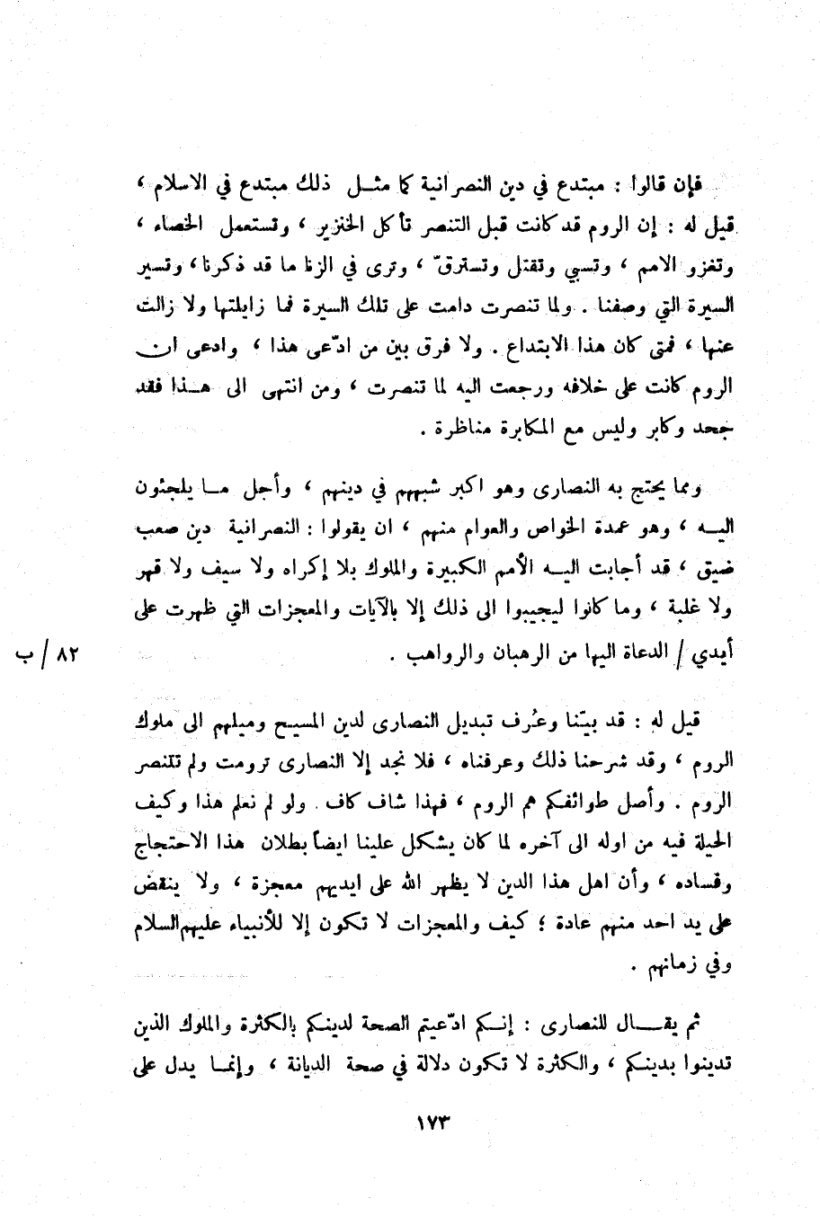 فإن قالوا: مبتدع في دين النصرانية كما مثل ذلك مبتدع في الاسلام، قيل له: إن الروم قد كانت قبل التنصر تأكل الخنزير، وتستعمل الخصاء، وتغزو الامم، وتسبي وتقتل وتسترقّ، وترى في الزنا ما قد ذكرنا، وتسير السيرة التي وصفنا. ولما تنصرت دامت على تلك السيرة فما زايلتها ولا زالت عنها، فمتى كان هذا الابتداع. ولا فرق بين من ادّعى هذا، وادعى ان الروم كانت على خلافه ورجعت اليه لما تنصرت، ومن انتهى الى هذا فقد جحد وكابر وليس مع المكابرة مناظرة.