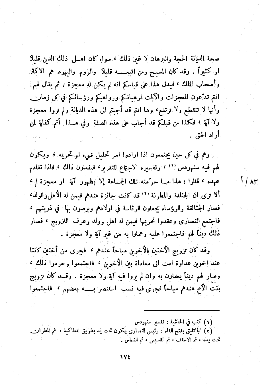 وهم في كل حين يجتمعون اذا ارادوا امر تحليل شيء او تحريمه، ويكون لهم فيه سنهودس «1» ، وتفسيره الاجتماع للتقرير، فيفعلون ذلك، فاذا تقادم عهده، قالوا: هذا ما حرّمته تلك الجماعة إلا بظهور آية او معجزة/، ألا ترى ان الجثلقة والمطرنة «2» قد كانت جائزة عندهم فيمن له الأهل والولد، فصار الجثالقة والرؤساء يجعلون الرئاسة في اولادهم ويوصون بها في ذريتهم، فاجتمع النصارى وعقدوا تحريمها فيمن له اهل وولد وعرف التزويج، فصار ذلك دينا لهم فاجتمعوا عليه وعملوا به من غير آية ولا معجزة.
